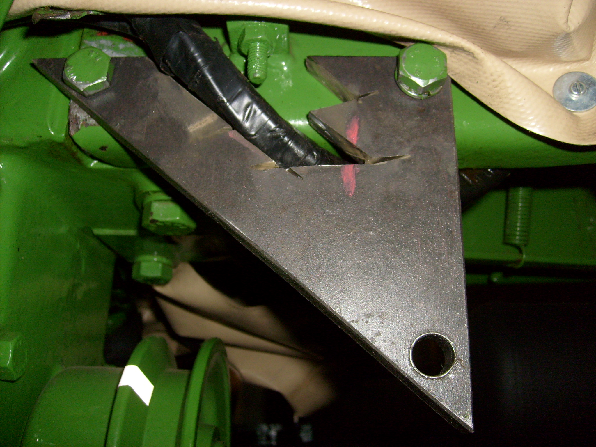 Der schon angesprochene Bolzen für die Verbindung von Mähwerk Antrieb und Mähwerk Tragrahmen hat am Ende einen erhöhten Griffrand. Damit die Bohrung für die Splintbefestigung dennoch gerade wird muss diese Erhöhung auf der gegenüberliegenden Seite ausgeglichen werden, z.B. mit einer Unterlegescheibe in entspechender Stärke.
