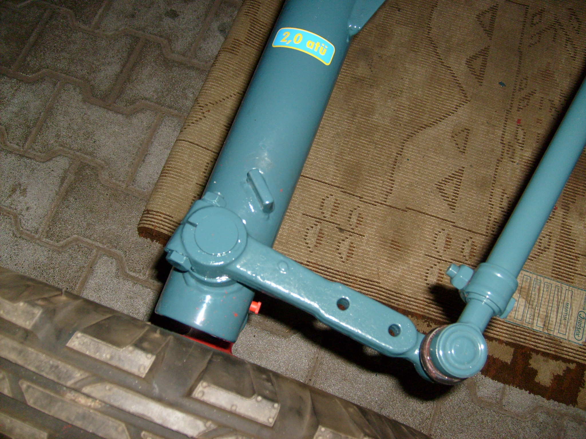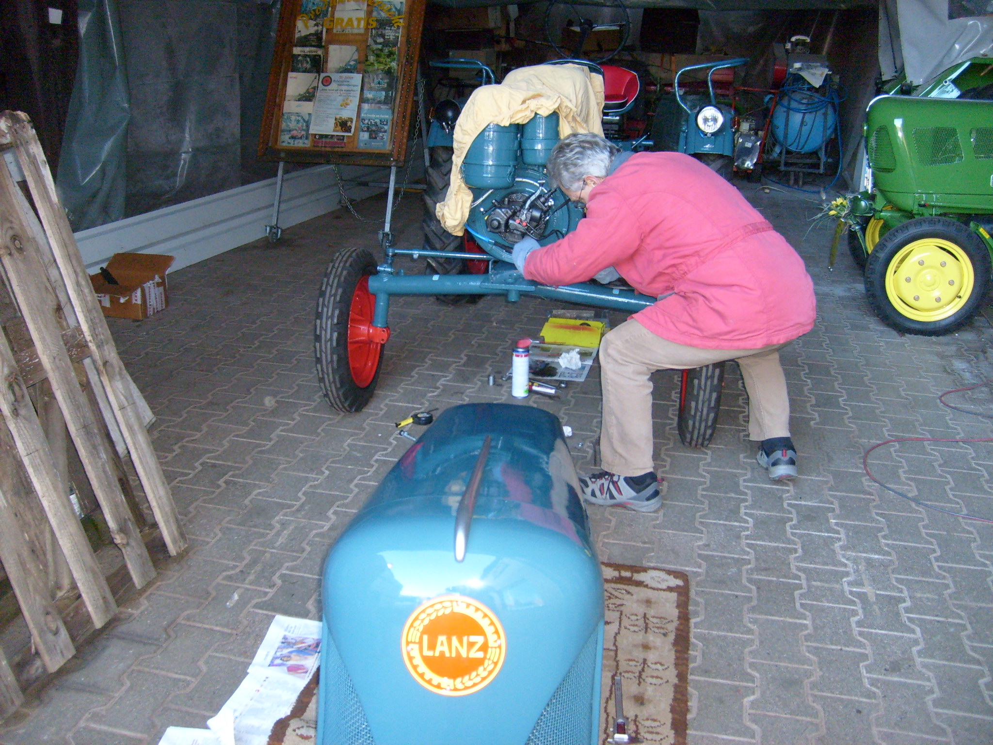Gestern haben wir rechtzeitig noch vor dem großen Schneesturm die hydraulische Anlage entlüftet. Öl war ja bereits eingefüllt. Nun tat sich aber auch nach einigen Minuten nichts, die Zylinder bewegten sich nicht. Das konnte eigentlich nur an zwei Dingen liegen. Entweder es war noch Luft in der Hydraulikpumpe oder die Hydraulikpumpe ist kaputt. Die Bedienungsanleitung sagt dazu nichts, außer wie man das alte Öl aus den Hydraulikzylindern ablässt über die Entlüftungsschrauben an den Zylindern und wie hoch der Ölstand dann im Gehäuse sein muss nach dem auffüllen mit neuem Öl. Ein Blick in die Ersatzteilliste brachte dann Klarheit. Dort sind Entlüftungsschrauben an der Pumpe angegeben. Die haben wir nicht ganz rausgedreht sondern nur gelöst. Darunter sitzt je eine Feder und eine Kugel, die nicht verloren gehen dürfen. Nun wurde der Motor gestartet, der Handhebel auf heben gestellt und nach kurzer Zeit quoll das Öl aus den vier Entlüftungsstellen. Motor abgestellt, eine Entlüftungsschraube ganz rausgedreht um den darunter sitzednen Kupferdichtring zu erneuern und dann mit großen Augen festgestellt "Mist! Die Größe ist gar nicht in unserem Sortiment!" Ich bin dann zum gut sortierten Massey Ferguson Händler gefahren, der hatte die. :D Zuhause angekommen wurden die vier Entlüftungsschrauben mit den vier neuen Ringen montiert. Vor dem festziehen sicherheitshalber noch einmal die gleiche Prozedur, Motor laufen lassen, Handhebel auf heben, solange bis das Öl aus den vier Stellen quoll. Unter gleichzeitigem stellen des Hebel auf heben die vier Schrauben festgezogen. Nach etwa 2 Minuten tat sich dann etwas am Zwischenachs- Hydraulikzylinder. Als der ganz ausgefahren war kamen die beiden hinteren auch, aber nur ruckweise nach und nach. Als alle ganz oben waren wurde der Handhebel auf senken gestellt und dann mit Muskelkraft die Hydraulikzylinder nach unten gedrückt. Es hängt ja hinten noch nichts dran, weder Unterlenker noch Hubstreben und vorne ja auch nichts. Das wurde einige Male wiederholt. Als nach dem x-ten male die Hydraulik noch nicht so funktionierte wie sie soll wurde der Motor abgestellt und mal nach dem Ölinhalt geschaut. Weit unter der vorgegebenen Marke. Also Öl nachfüllen. Motor an und wieder hoch heben, nun stand ich dabei auf den Hydraulikarmen, um mal ein wenig Last zu simulieren und das entlüften zu beschleunigen. Beim herunterlassen der Hydraulik floss dann auf einmal Öl aus den Entlüftungsschrauben, aha, es tut sich was. Nach ungefähr 20 mal hoch und runter hörte es auf aus der Entlüftung zu fließen und die Hydraulik funktionierte vorne und hinten ruckfrei. Da es an den neuen Hydraulikzylindern keine Entlüftungsschrauben gibt scheint sich die hydraulische Anlage über die Entlüftungsschraube des Gehäuses zu entlüften, an dem auch die hydraulische Pumpe angeflanscht ist. Eigentlich ganz praktisch. Vor dem arbeiten an der Hydraulik aber immer grossflächig Pappe und Zeitungen unter legen....