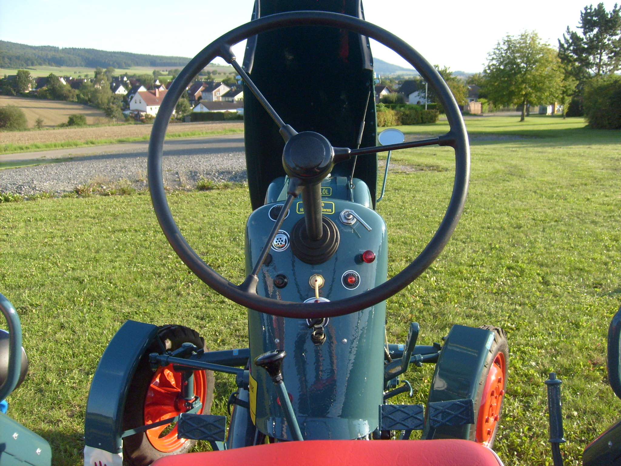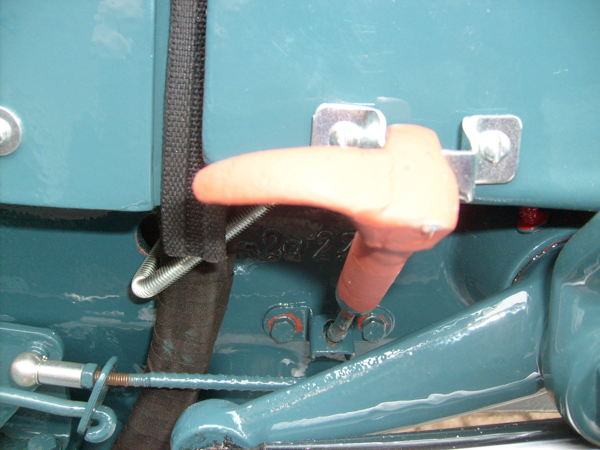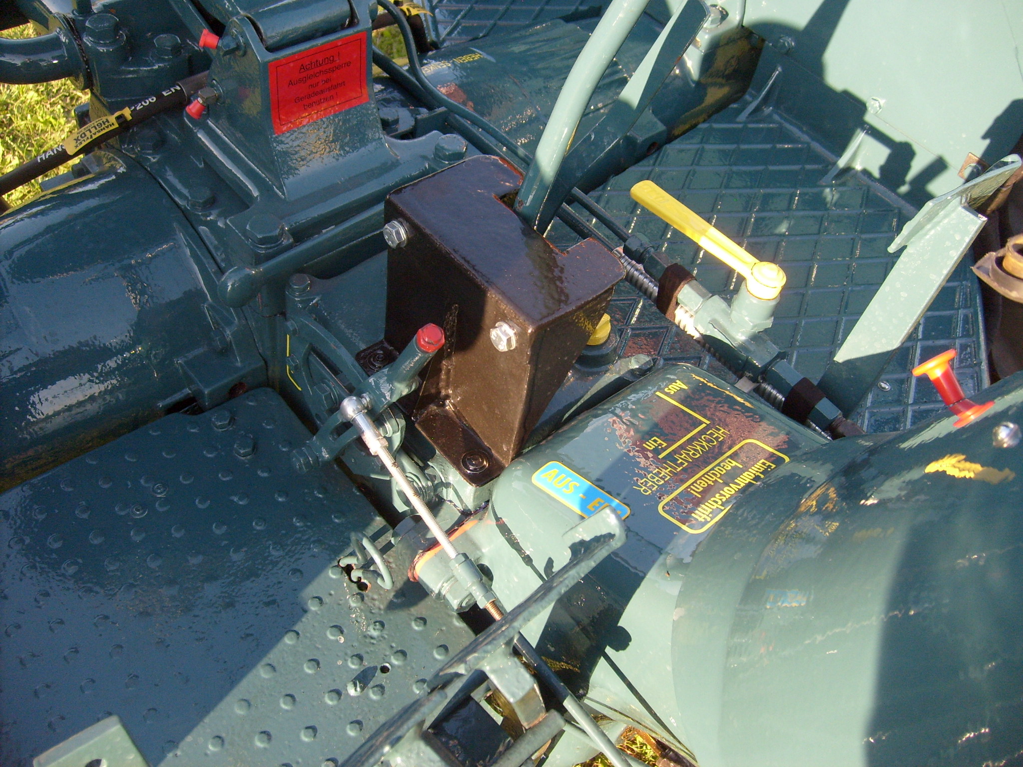 Dann wurde noch ein ganz seltsames Problem behoben. Der Betätigungshebel für die Hydraulik sitzt beim 13 er links neben dem Fahrersitz. In seiner Freigang Stellung für die Arbeit auf dem Acker muss der Hebel in einer Raste eingerastet werden. Diese Raste ist nur ein dünnes Federblech und bei den meisten 13 er mitlerweile sicherlich defekt. Ich habe diese gegen einen Federstecker ausgetauscht, der an dem Winkel angeschweisst wurde der sonst das Federblech hält.. Beim draufsetzen auf den Sitz federte nun die Sitzschale so weit nach unten das er mit dem Kugelknopf des Handhebel in Berührung kam und der Hebel aus seiner Raste sprang. Was das denn?