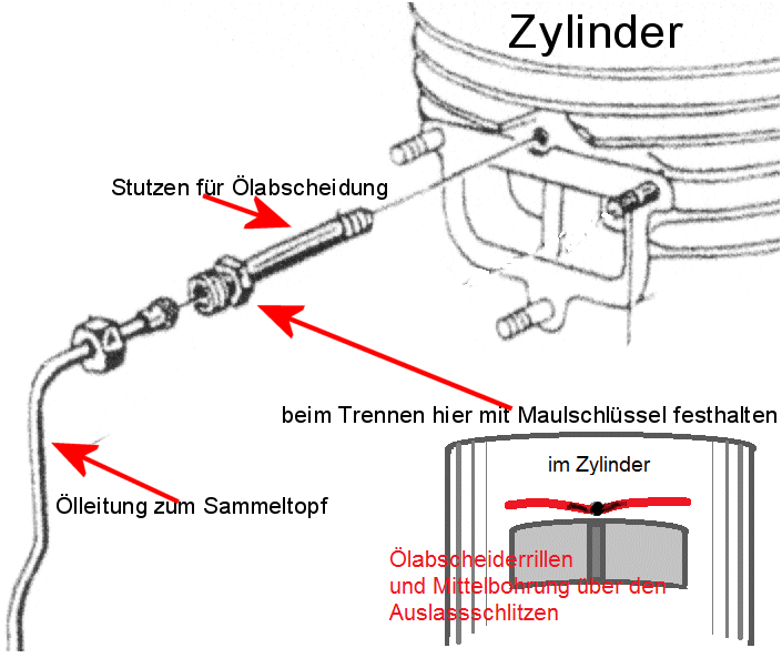 In Deinem Ersatzzylinder sollten oben und unten die gleichen Ölnuten eingefräst sein und die Ölabläufe nach außen funktionieren. Der obere Ölablauf muss außen ein intaktes Gewinde zur Aufnahme des kurzen Ölstutzens von Deinem Altzylinder aufweisen. Gleiche Zylindermaße sind Voraussetzung. Das Kolbenmaß des neuen Zylinders sollte nicht größer sein als das des alten. Nach dem Schleifen des neuen Zylinders fräst Du den Mittelsteg vom Auslass von innen etwas ab, damit er bei Erhitzung nicht in den Kolbenweg wachsen kann.