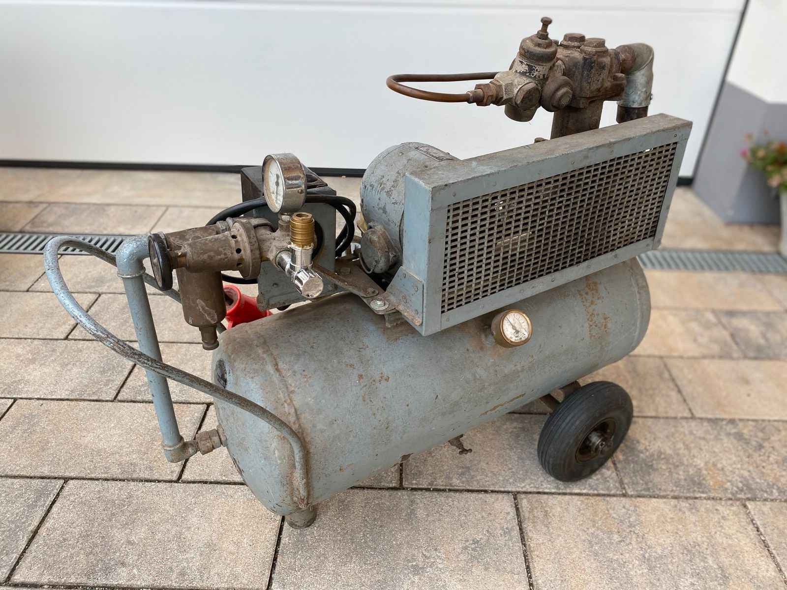 Verkaufe hier einen Kompressor aus 1944. Er besteht aus einem 40l Druckbehälter der Firma Knorr Bremse (vermutlich vorher an einem LKW montiert) und einem Bosch Verdichter samt Druckregelventil. Der Kompressor funktioniert und schaltet bei ca. 7bar ab. Es ist des Weiteren ein Druckminderer verbaut, sowie ein nachträglich angebrachter Absperrhahn. Der Elektromotor wurde 1958 umgewickelt. Außerdem besitzt der Kompressor noch die Originale Continental Luftbereifung.
