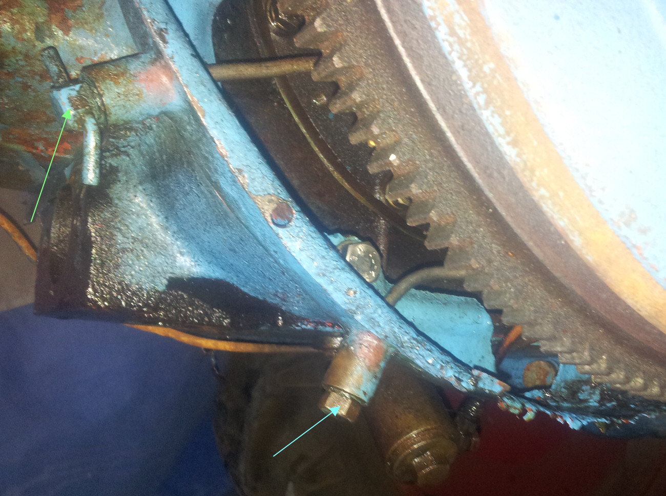 (hellgrüner und hellblauer Pfeil) Welche Flüssigkeit lässt man mit diesen beiden Ablassschrauben ab ?