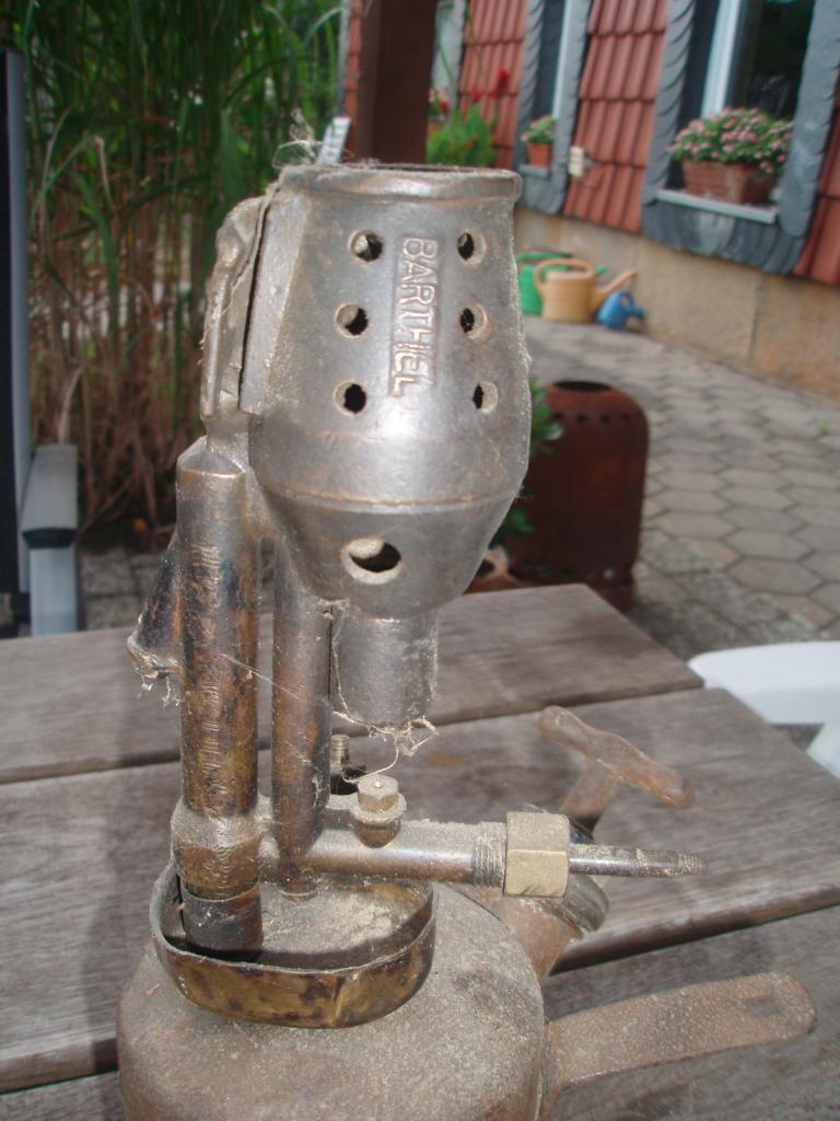 links eine komplett Barthel, rechts Brennerkopf Imbert, Behälter Barthel