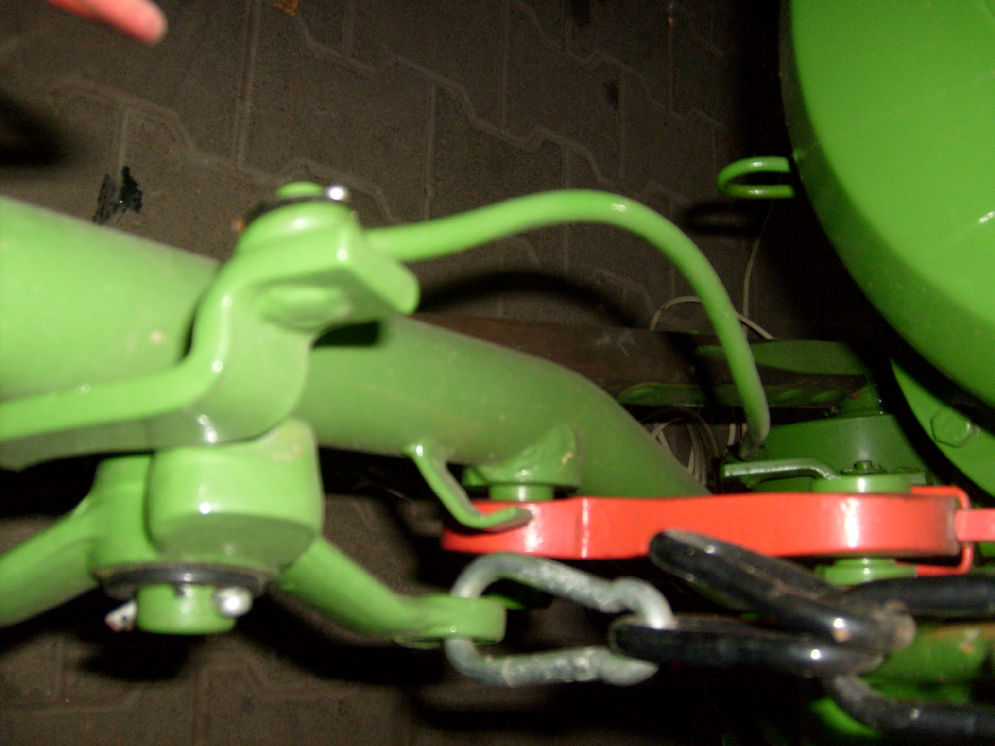 Das Teil mit den drei Bohrungen wird mit der großen Bohrung so auf den Zapfen am Mähwerkrahmen gesteckt, dass die "Nase" zum Hinterrad zeigt. Die "Nase" betätigt beim Anheben des Mähwerkes über einen Hebel mit Gestänge die Messerkupplung. Sie wird also ausgerückt, damit die Holzexenterstange nicht bricht, falls man vergißt das Mähwerk vor dem Anheben abzuschalten. Die Kette wird in den hydraulischen- Aufzughebel-Haken am Bulldog eingehangen. Der S- Haken wird in die noch verbliebene Bohrung eingehangen, die andere Seite des S- Haken wird in die Bohrung des kleinen schwarzen Hebel eingehängt, der bei Dir senkrecht nach oben steht.