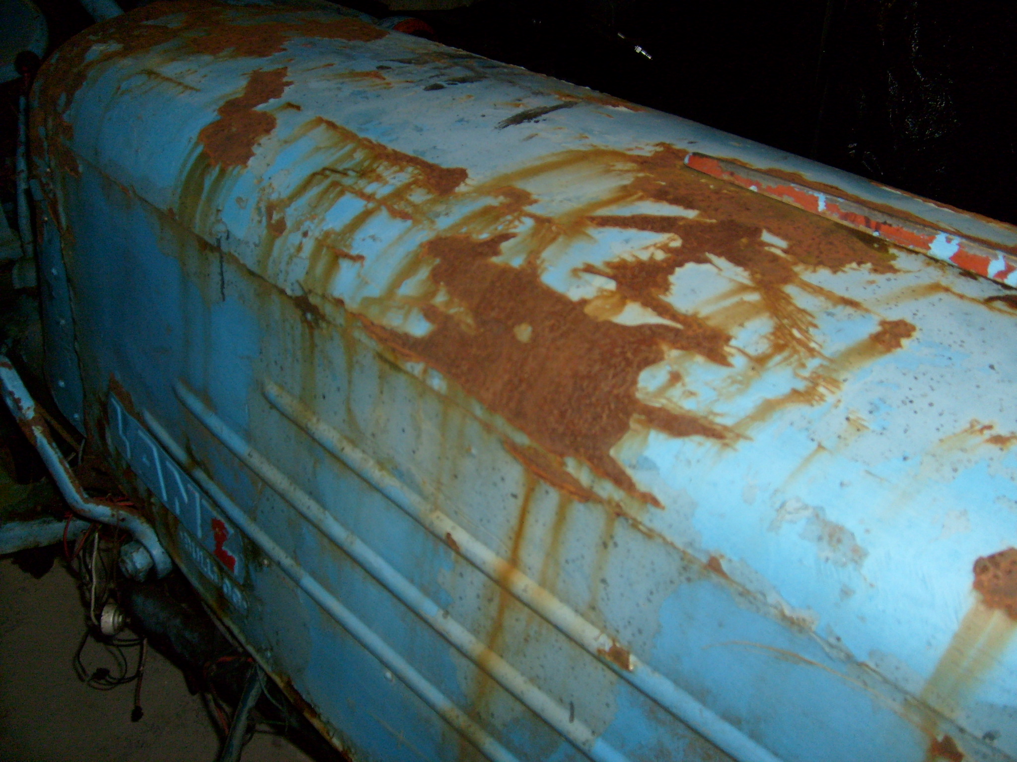 Feuchtfröhliche Farbenspiele gab es dann beim Kraftstofftank. Man erkennt die Originalfarbe, den nachgepinselten Lack und diverse andere Farbtöne. Azurblau ist auch dabei.