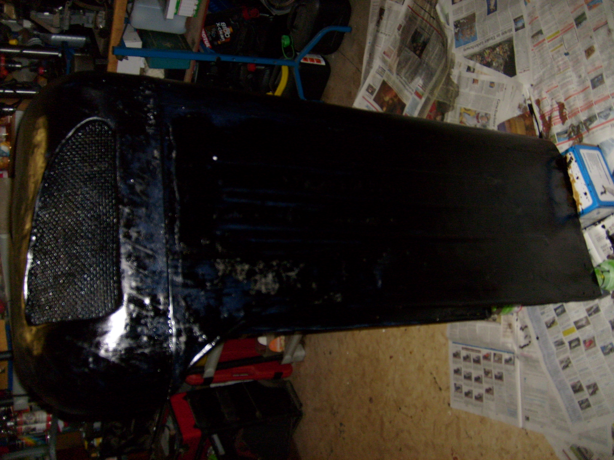 Der vordere Teil der Motorhaube steht dabei unten auf dem Boden. Durch schwenken der Haube läuft dann alles überschüssige Fertan, dass sich im untersten Bereich gesammelt hat, zurück in den durch das Gitter verdeckten Blechbereich. So wurde dann erst die Innenseite der Motorhaube komplett von oben nach unten gepinselt. Bilder von der schwarzen Motorhaube folgen.