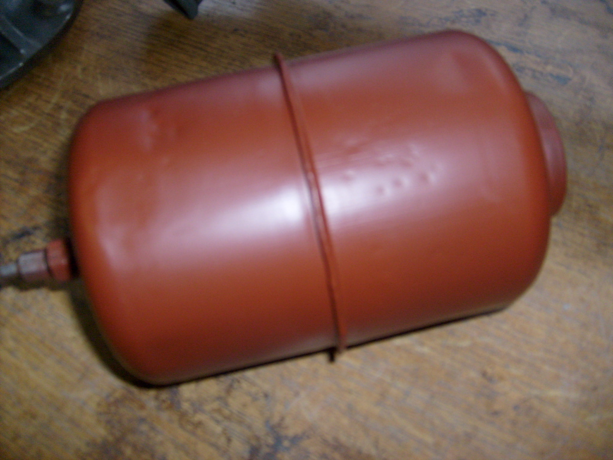 Jetzt wo die Tankhalterung wieder so schön ist hatte ich Greuel davor, den Kraftstofftank so geschunden wie er war wieder einzubauen. Selbst wenn wir den dicht gelötet hätten, kein Spachtelauftrag der Welt hätte daraus wieder eine runde Sache gemacht. Und vor allem nicht dauerhaft haltbar, was den Spachtelauftrag betrifft der dann so über 10 mm gelegen hätte. Hätte man dann verzinnen müssen. Alles sehr aufwändig. Es war ja nicht nur der innere Teil eingeknickt, auch die beiden runden Tankdeckel an den Seiten waren eher Eiförmig. Was tun? Profi an den Start holen! Gesagt getan. Einen Seitendeckel hat er sofort rausgeflext :shock: Öhmmmm :oops: :lol: "Vertraue mir!" :twisted: ... NNNN... Na gut..... :lol: Dann hat er den Knick vom Innenteil und dem Eiförmigen noch angeschweißten Seitenteil gerichtet, den äußeren Deckel gerichtet und wieder angeschweißt mit dem WIG- Verfahren. Dann wurde der Tank am Ablauf verschlossen, mit Wasser gefüllt und auf den Tankdeckel eine Hydraulikpumpe angeschlossen, die mit kontrollierbarem Druck Wasser in den Tank drückte. Somit wurden die letzten Unebenheiten rausgedrückt! :shock: Genial! :D Bei dem Abdrücken stellte ich dann heraus, dass der Tank eher einem Brausekopf glich. Es tröpfelte aus gefühlten 20 bis 30 Stellen. Die Autogen zusammengeschweißten Kesselbleche des Tankes haben Alters- und Vibrationsbedingt irgendwann einfach Ermüdungsrisse bekommen. "Sowas schweißt man heutzutage nicht mehr Autogen, da die Wärmemenge die in das Blech eingeleitet wird unnötig hoch ist.", sagte der Profi und fügte noch hinzu, "Zweitens kann das heutzutage kaum noch Jemand vernünftig und drittens gab es in den 50 er Jahren noch keine WIG- Schweißgeräte." Umso mehr huldigen wir mit der Oldtimerei den alten Techniken und sagen "Die konnten früher schon was und hatten schwierigere Bedingungen wie heute!" :) Sämtliche undichte Stellen und die umlaufenden Deckelschweißnähte wurden komplett neu nachgeschweißt. 5 Stunden Arbeit später und absolut lohnenswerte 100 Euro leichter war der Tank wieder schön. :D Grundiert wurde auch gleich, damit nicht wieder unnötig Rost anläuft.