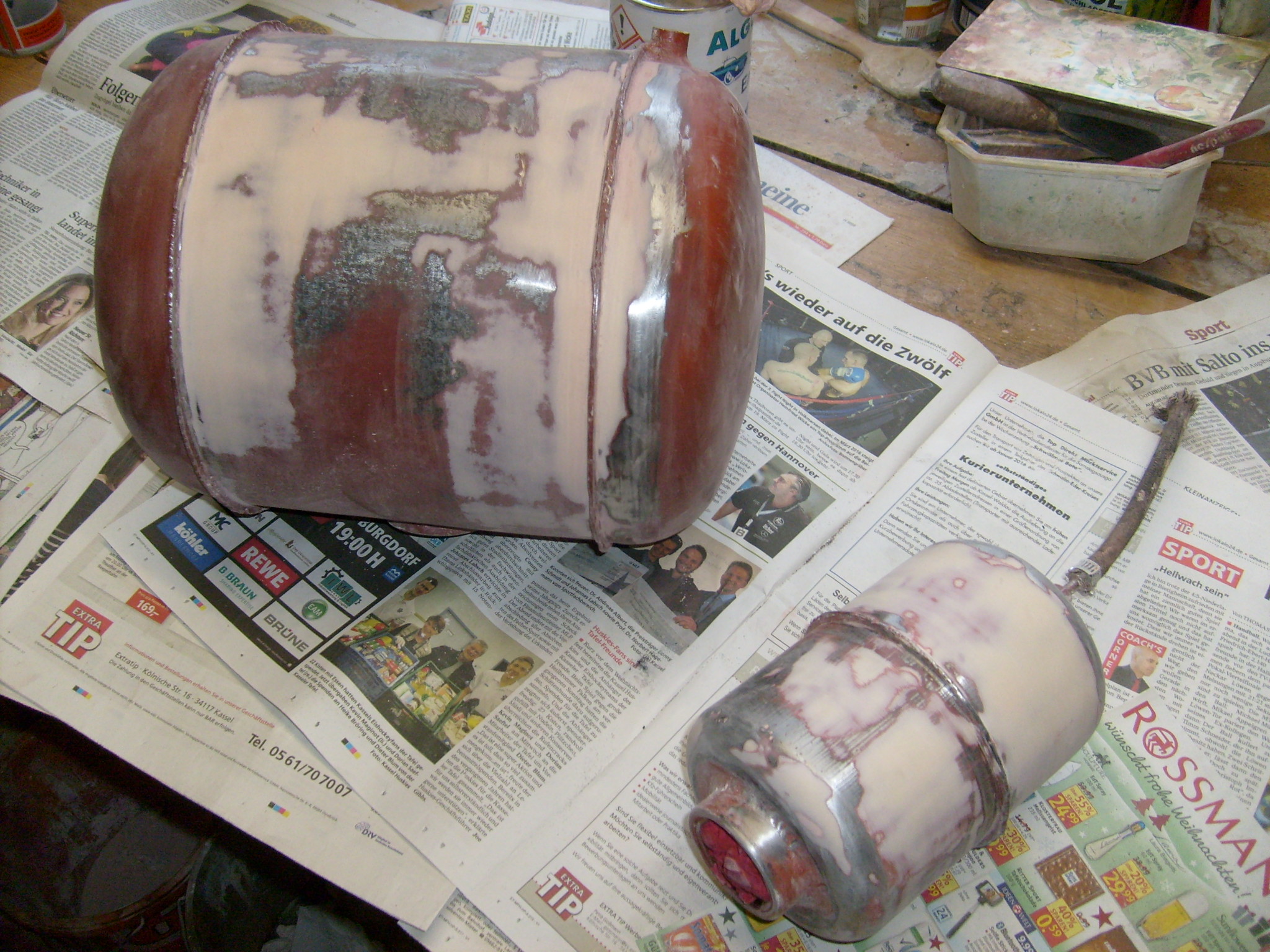 Hier mal ein Bild von den fertig gespachtelten und geschliffenen Tanks. Vor allem der kleine Öltank war nicht einfach zu bearbeiten. Je kleiner der Durchmesser desto schwieriger die Spachtel-und Schleifarbeit.