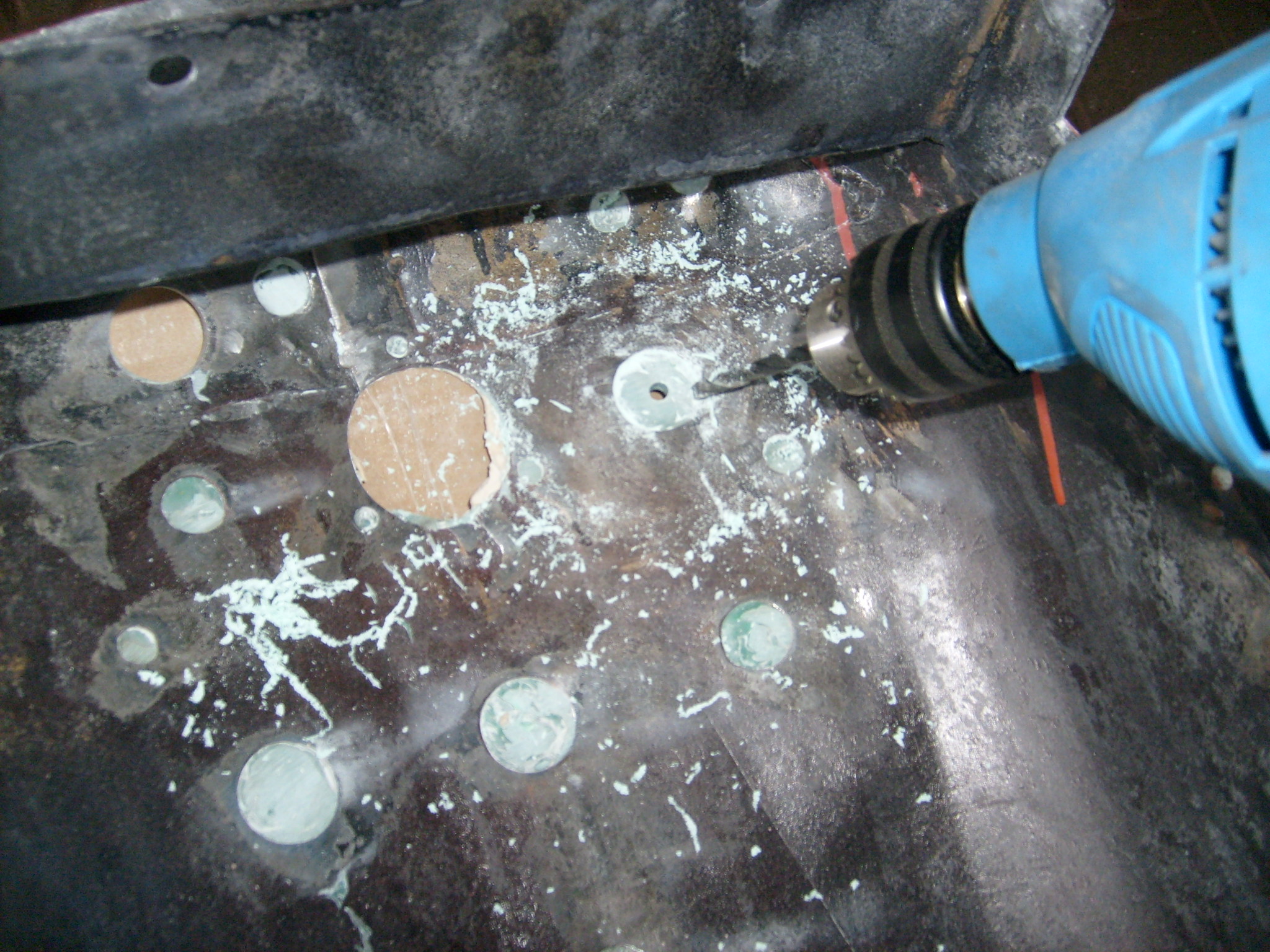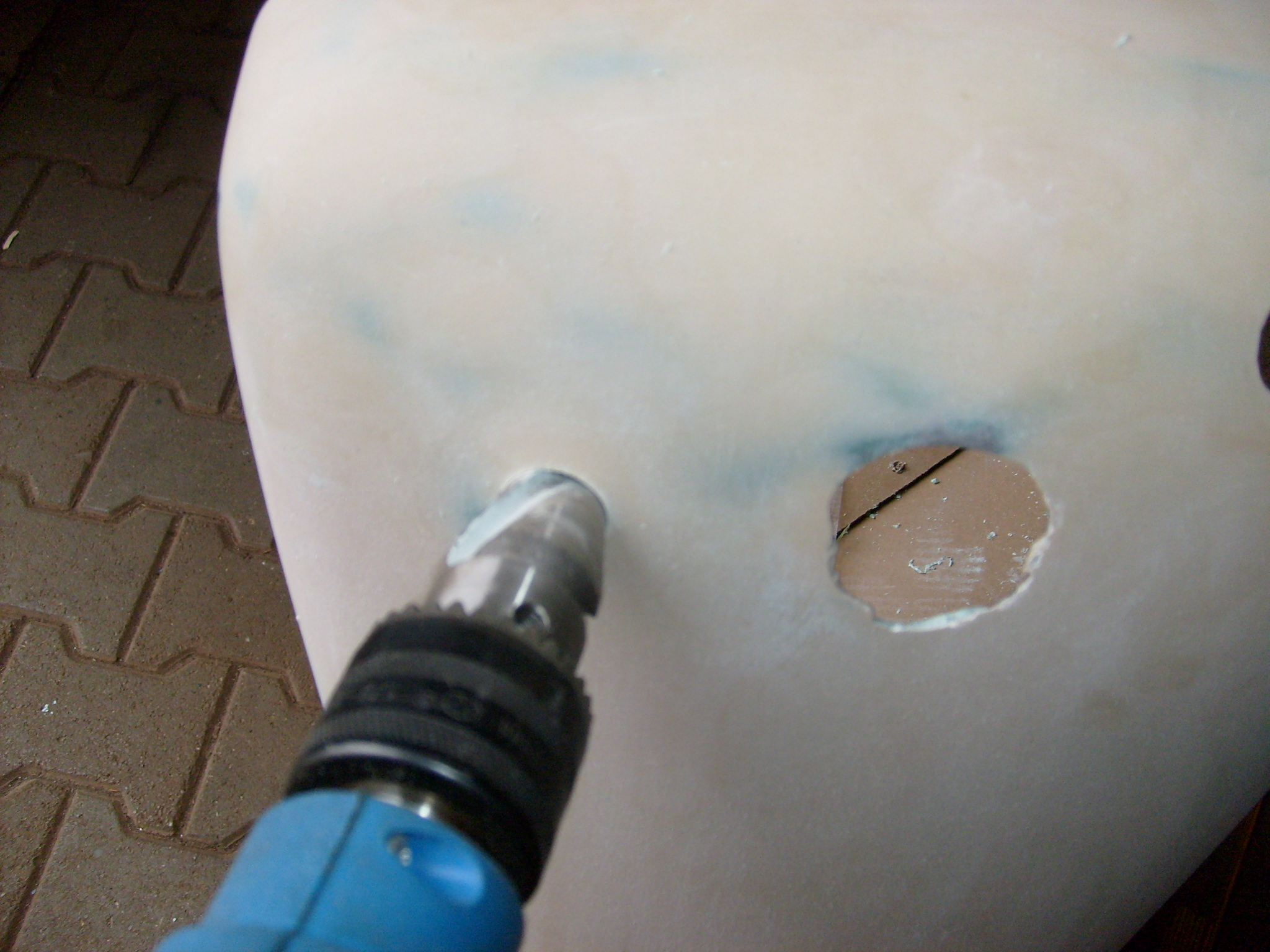 Es galt 4 Instrumente mit einem Gewindedurchmesser von rund 25mm einzubauen. Auf der Rückseite wurde klar, ja, diese sind auch vorhanden. Schön. Nur, wo kommt was hin? Beim Kauf des Schleppers war schon alles ausgebaut. Also selber kreativ werden, wie das Ganze denn am sinnvollsten zu handhaben ist. Nach einer Stunde probieren war die Belegung eigentlich klar...Betonung liegt auf eigentlich. Nachdem mit der Flex und einer Fächerscheibe auf der Rückseite überstehender Spachtel, der aus den Bohrungen gequollen war, abgeschliffen wurde, konnte das erste 25mm Loch von hinten mittig mit einer Handbohrmaschine und einem 6 mm Bohrer aufgebohrt werden. Na? Ist denn der Bohrer stumpf? Nimmt ja gar kein Ende... :shock: Jetzt weis ich auch wo die 1,5 kg Glasfaserspachtel geblieben sind, frei nach dem Motto "Darf´s ein bißchen mehr sein?" :D Und da kommt wieder das Wort eigentlich in´s Spiel. Das Gewinde des Blinkerschalters z.B. ist schlichtweg zu kurz, damit man noch die Mutter vorne drauf bekommt... Warum machen die das Gewinde so kurz? 10mm länger, würde ich gerne 1 Euro mehr für ausgeben, aber nein. Warum einfach wenn´s auch schwierig geht? Wir hatten im Teileregal noch einen alten Blinkerschalter der genau über so ein längeres Gewinde verfügt. So einer muss dann eben neu nachbestellt werden. Kein Drama. Also wurden erst mal alle 25 mm Löcher aufgebohrt, was dann übrigens von vorne mit einem Stufenbohrer prima funktionierte. Die 1- stündige Planung war jedenfalls für die Katz, denn im Endeffekt wurde die Belegung ganz anders. Theorie und Praxis... Glücklicherweise paßten die anderen drei Instrumente gerade so eben. Die Gewindelängen gaben die Einbaulage vor.