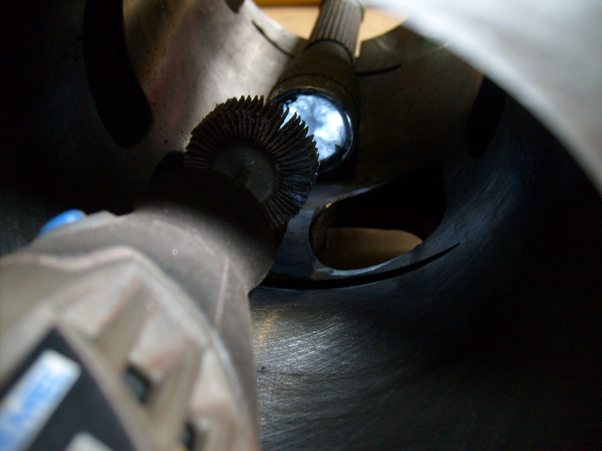 In Ermangelung von Alternativen wurde der Dremel mit Fächerscheibe gezückt und gleich soviel Luft gegeben, dass es für die nächsten 3 Kolbenübergrößen auch noch passt. Wenn schon denn schon... :D