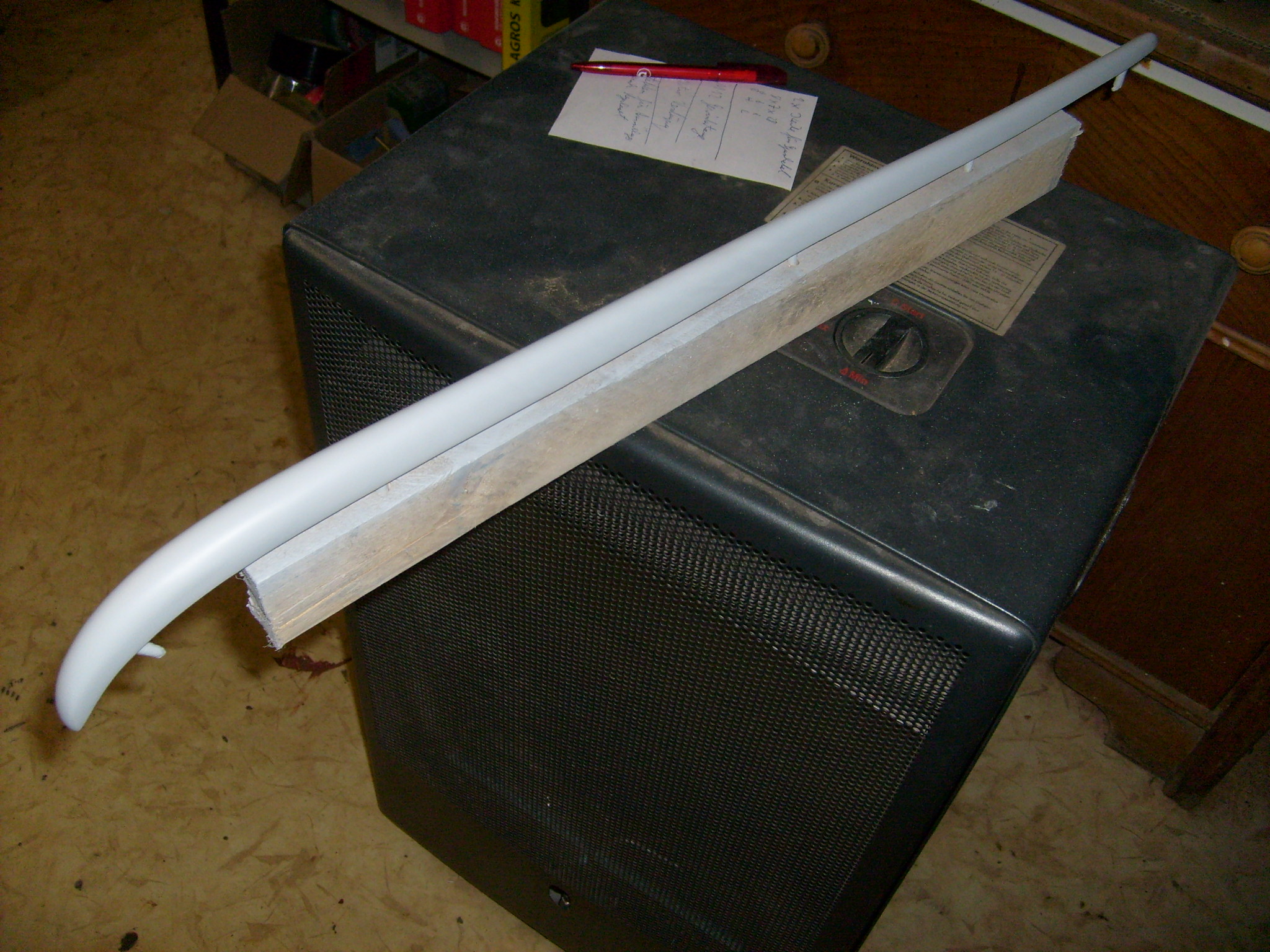 Im Bild die fertig grundierte Zierleiste. Zum lackieren nimmt man eine Dachlatte hochkant und bohrt dort 6 mm Löcher rein, wo die Befestigungsschrauben unter der Zierleiste sind. Man umwickelt die Gewinde dann mit Klebeband, damit kein Lack drauf kommt und steckt die Gewinde dann in die Löcher der Dachlatte. So hat man eine schöne Halterung. Optimal bei tiefen Temperaturen ist, wenn man die Leiste dann oben auf den Ofen legt, einmal vor dem grundieren, einmal später. Die kleine Stufe reicht dabei vollkommen aus, um eine schnelle Trocknung zu gewährleisten. :D