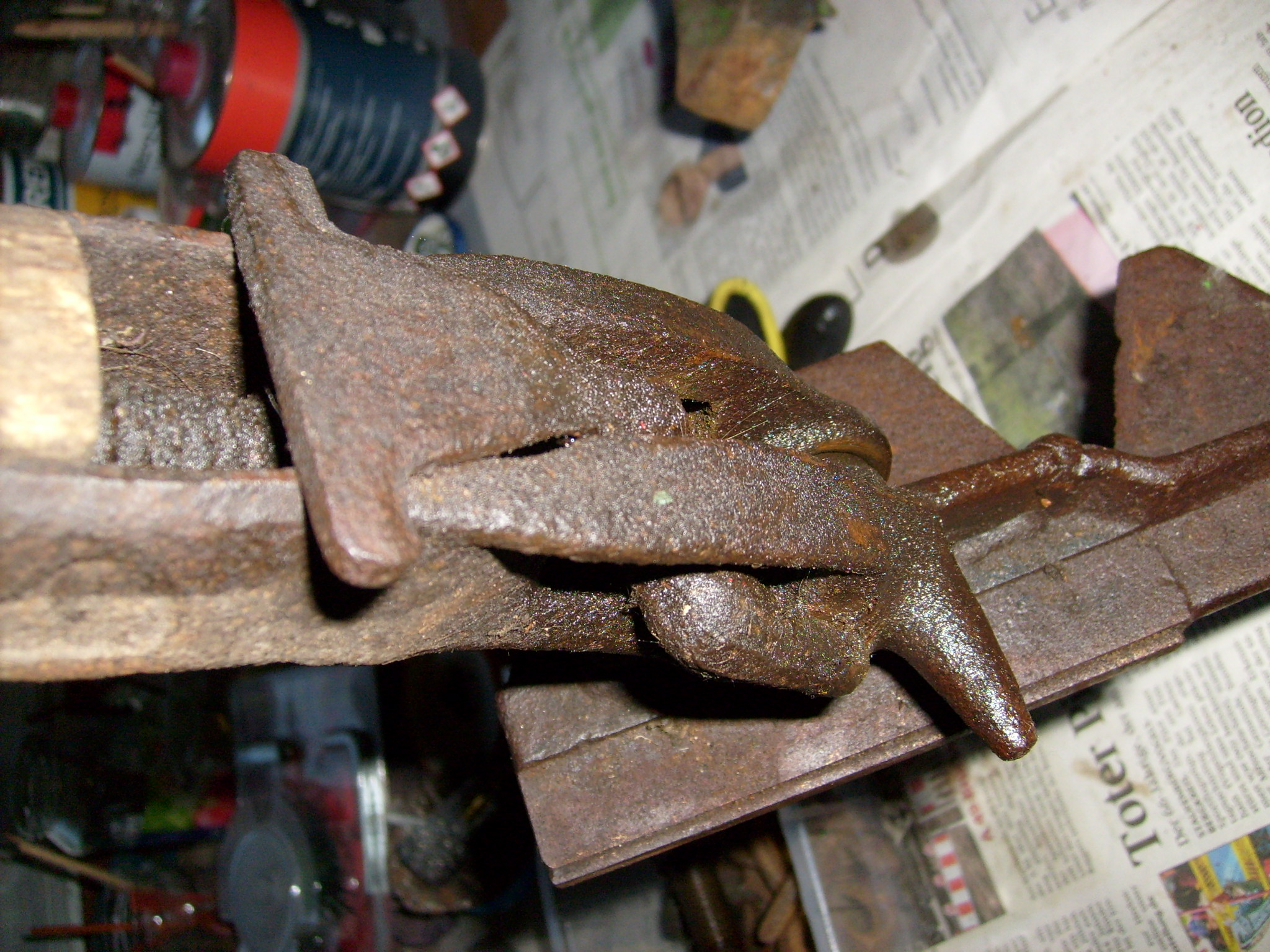 Mit dem an der Spindel schon fehlenden Spannbügel hätte das sowieso nicht funktioniert. Eine nicht all zu große bzw. lange Rohrzange diente zum drehen. Natürlich ist es damit schwerer diese fest gerostete Verbindung zu lösen. Man spürt aber besser, wenn man kurz davor ist die Schraube zu überdehnen. Im Wechsel zum Brenner wurde dann mit Rostlöser, WD 40 und Motoröl das Gewinde bearbeitet. Dabei dreht man am besten nicht immer in eine Richtung sondern immer hin und her, damit das Kriech- und Motoröl immer besser in das Gewinde hinein kommt. Wo man mit der Bohrmaschine und Bürstenaufsatz herankommt wurde auch das Gewinde schon entrostet, dass dann die klemmende Wirkung im Gewinde reduzierte. Wichtig ist auch, dass man schon Tage vorher die drehbaren Teile mit Rostlöser behandelt. Denn wenn diese festgerostet sind, wie bei mir auch wieder der Fall, kann man das festgerostete Gewinde um so schwerer gangbar machen. Da alle Bauteile zusammenhängen ist das etwas schwierig. So musste nach entfernen eines Spannstiftes am Ende der Spindel mit Gewalt erst die Spindel ganz herausgeschraubt werden, um eine M12 er Befestigungsschraube entfernen zu können. Erst danach konnte das im Bild in der Luft hängende Teil abgebaut und danach gangbar gemacht werden. Das gilt auch für das Gewindeteil, in das das andere Ende der Spindel eingreift. Leider hat das einsprühen mit Rostlöser Tage vorher hier nicht wirklich funktioniert. Lanz hat bei dieses Teilen einfach zu wenig Luft/Spiel zwischen den Teilen gelassen. Zudem steht in der Betriebsanleitung nicht, dass man diese Teile auch mal von Zeit zu Zeit mit WD 40 behandeln sollte...oder mit einem vergleichbaren Produkt aus dem Baumarkt von 1960.... :wink: