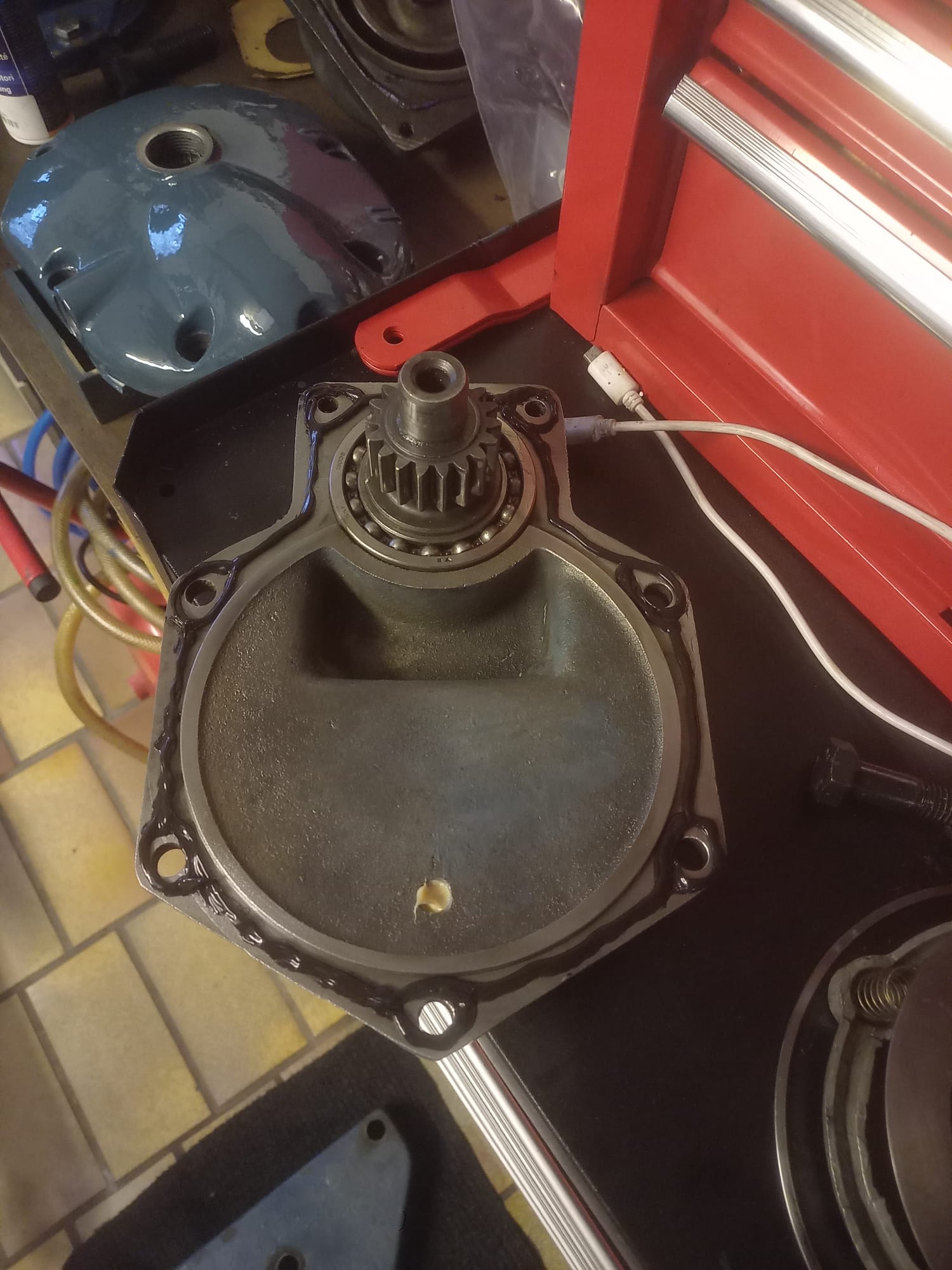 Maschine angehangen - Gerät angehoben und nach einigen Metern fahren sackte die Hydraulik ab. Dann konnte ich sie noch 2-3 mal anheben, sackte aber sofort wieder ab. Mulcher abgehangen, in die Werkstatt, Pumpe abgebaut - da lief aus dem Zwischengehäuse bereits Hydrauliköl - dieses Gehäuse ist ja normal nur über den Schmiernippel gefettet. Da ich den Deckel des Hydraulikblocks hinten abmachen wollte, wollte ich über die Ablassschraube das Hydrauliköl ablassen. Siehe da, da kam ausser einem Schnapsglas voll nichts. Verloren hatte ich auch nichts. Dann Kontrollschraube aus dem Getriebe gedreht und siehe da. Da kam das überschüssige Öl raus. Pumpe hat das Hydrauliköl also durch den Simmering ins Zwischengehäuse gedrückt, als das Gehäuse voll war, ist das Hydrauliköl offensichtlich über den Wedi der Getriebewelle ins Getriebe gelaufen.