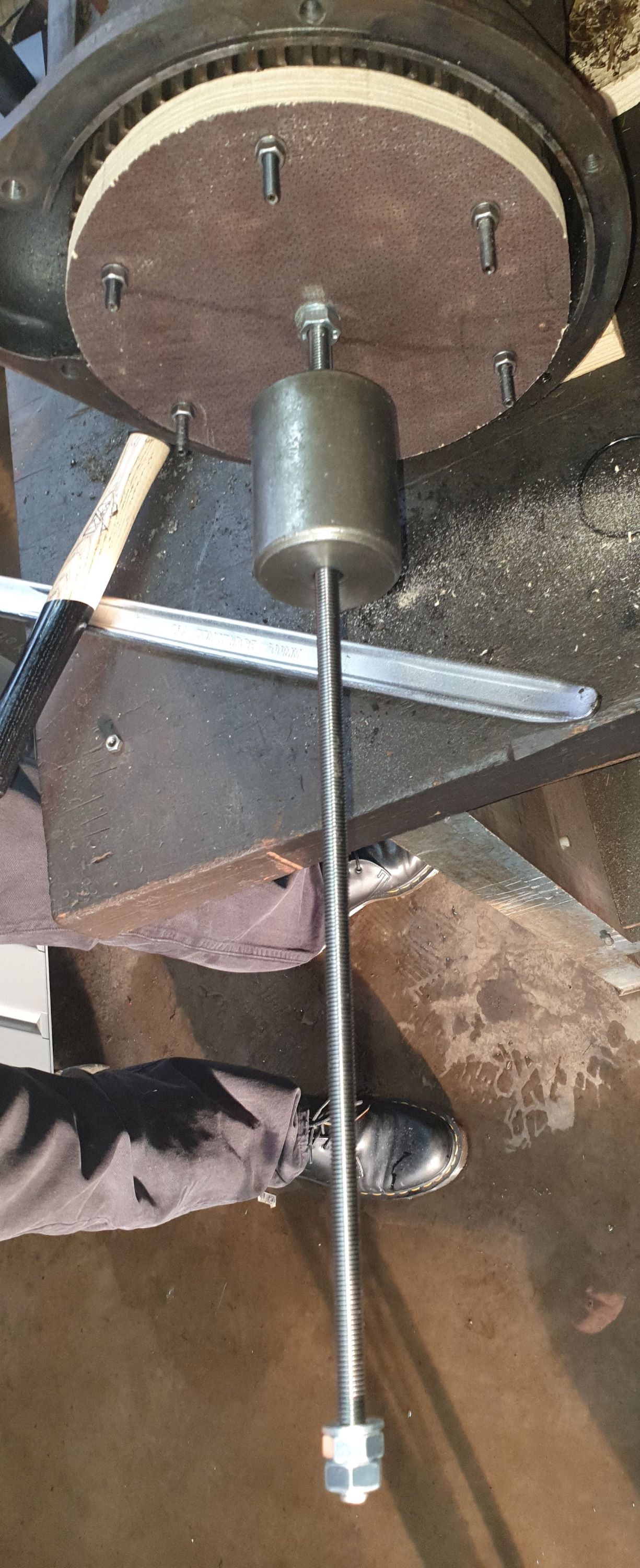 Ich bin gerade dabei einen TWN LT85D Motor meines Lanz Alldogs zu restaurieren und habe nun das Problem, dass sich die Schwungmasse nicht abziehen lässt. Wie auf den Bildern zu erkennen habe ich versucht einen Abzieher aus 15mm starken Verbundholz zu bauen. Zuerst habe ich damit Versucht die Schungmasse mit dem Gewicht herunter zu klopfen. Als dies dann keinen sichtbaren Erfolg brachte habe ich meine Konstruktion zu einem Abzieher umgebaut und versucht so die Schungmasse abzuziehen. Doch aus das hat nicht funktioniert, den die Holzplatte hat sich dabei ordentlich verbogen. Nun also meine Frage: Wie war das ganze den Original gedacht gewesen. Gibt es für das Teil irgendeinen Abzieher und wie sieht die Welle auf auf der die Schwungmasse sitzt aus? Es ist mir bewusst, dass es zu dem Thema schon einen Beitrag gibt in welchem das Heißmachen vorgeschlagen wird. Jedoch erscheint mir diese Methode sehr risikoreich oder wie seht ihr das?