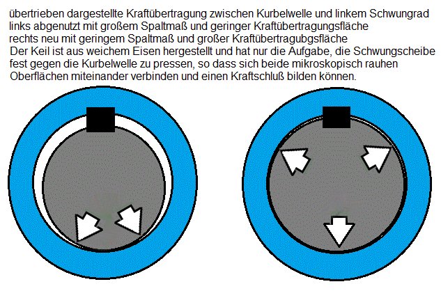 Sind die Kontaktflächen fettfrei und bei geringem Spaltmaß zwischen Kurbelwelle und Schwungrad neuwertig groß genug, verkeilen sie sich in einander und übertragen die Motorkräfte sicher.