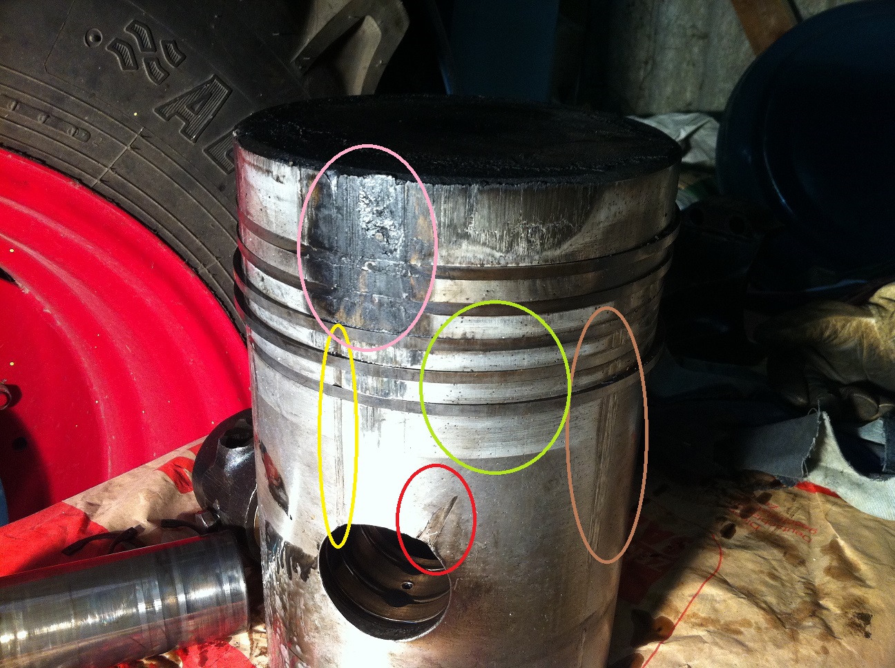 Auf der Auslaßseite ist mal der Sicherungsring des Kolbenbolzens herausgefallen und hat sich zwischen Kolben und Zylinder eingeklemmt. Vom Feuersteg bis zum Bolzenauge zieht sich daher eine tiefe Rille durch die Lauffläche, die Kolbenringe waren durchgebrochen (gelb und rot). Die gleiche Rille gab's natürlich auch im Zylinder, der daraufhin verworfen worden ist.