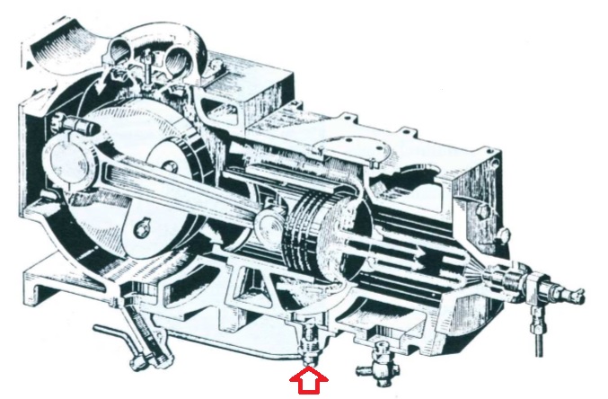 Hier ein Schnittbild von Deinem Bulldog-Motor. Der rote Pfeil zeigt auf das Doppelventil unter dem Zylinder hinter dem Wasserablasshahn.