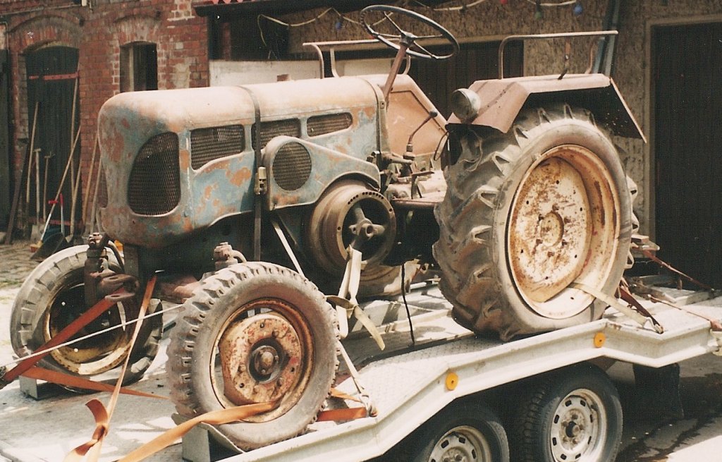 den D1616 habe ich im Jahr 1999 gekauft (@Gordon... 950DM damals noch abwertend als "Blechbulldog" bezeichnet), der sollte eigentlich geschlachtet werden, hat aber doch noch am Stück überlebt, weil die Technik überraschend gut war. Ich und einige meiner Bekannten haben uns über unerklärliche Späne im Kurbelgehäuse gewundert. Ich habe den ganzen Motor zerlegt aber alles war i.O. Ein paar Tage später kam dann die Erleuchtung, die Stahlwolle im Luftfilter fehlte. Man beachte auch die gefederte Achse am kurzen 16er.