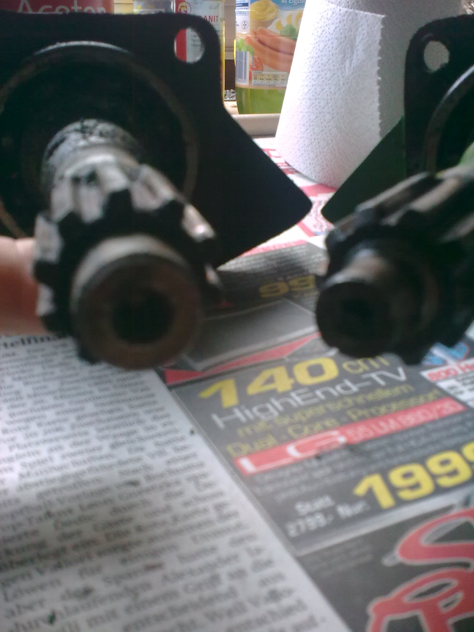 Nach dem entfernen der Knetmasse wollte ich gleich das neue Kugellager montieren. Aber ein defekter Sicherungsring, der in der Schwungscheibe hinter dem Lager montiert ist, machte diesen Plan zunichte. Aber es kam noch viel besser. Als ich das neue Lager in der Hand hielt und es probeweise auf die Getriebeeingangswelle setzte merkte ich plötzlich, dass der Durchmesser des Lagers innen viel zu groß war. Ein falsches lager bestellt? Ich gleich in die ET- Liste geschaut und mit einem Messschieber nachgemessen. Sollte eigentlich passen. Wird doch wohl nicht die Getriebeeingangswelle derart ausgenudelt sein? :? Klar. Worst case. Totalschaden. Die Getriebeeingangswelle hat nur noch einen Durchmesser von 12,5 mm. Sollmaß: 17mm... :shock: :x Also dieser kleine TWN- Diesel ist ein ganz schlimmer. Zerstört nicht nur sich selber mal gerne sondern frießt auch gleich noch den halben TRecker mit auf.... Glücklicherweise habe ich noch eine alte Kupplungsglocke mitsamt Antriebswelle. Hier mal der Durchmesser- Vergleich: