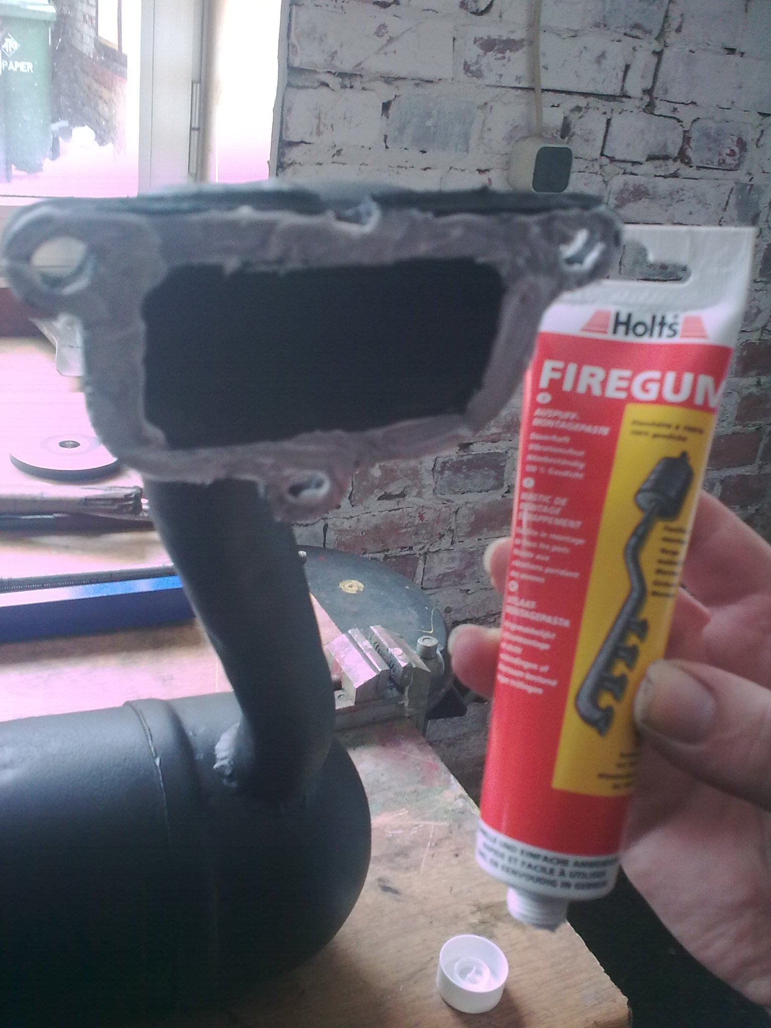 Bei der Montage wollte ich nun nichts mehr dem Zufall überlassen. Dichtfläche am Zylinder und Krümmerflansch wurden mit Bremsenreiniger entfettet und mit Firegum satt eingeschmiert. Dazwischen kam wieder die selbstgeschnitzte Dichtung. Das tolle an dem Zeug ist, es härtet unter Auspuffwärme aus und die verbundenen Teile werden dann dicht, aber die Teile lassen sich trotzdem wieder problemlos auseinanderbauen, wenn man z.B. den Auspuff ausbrennen will.