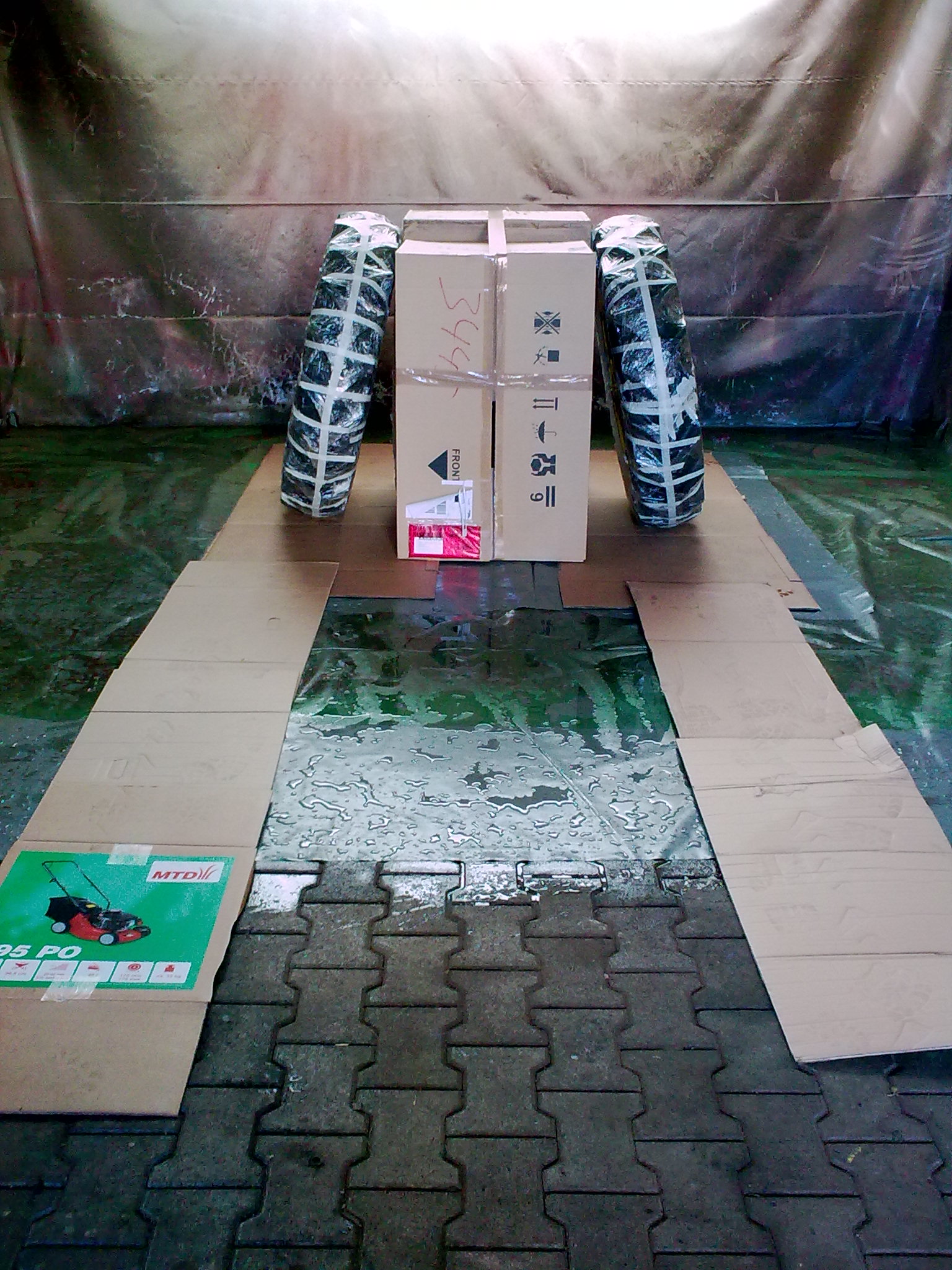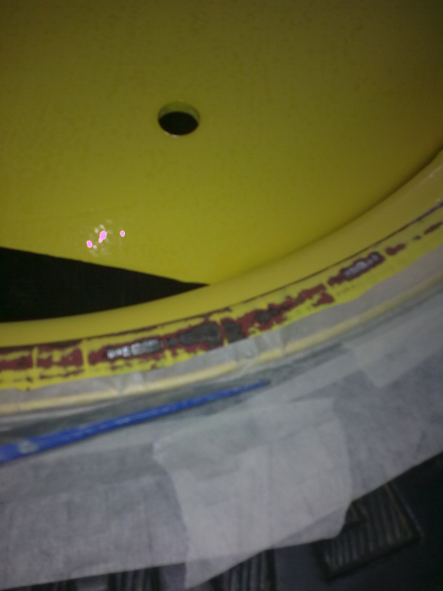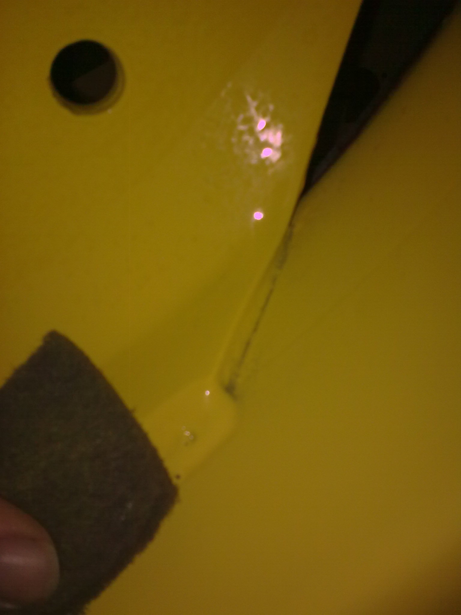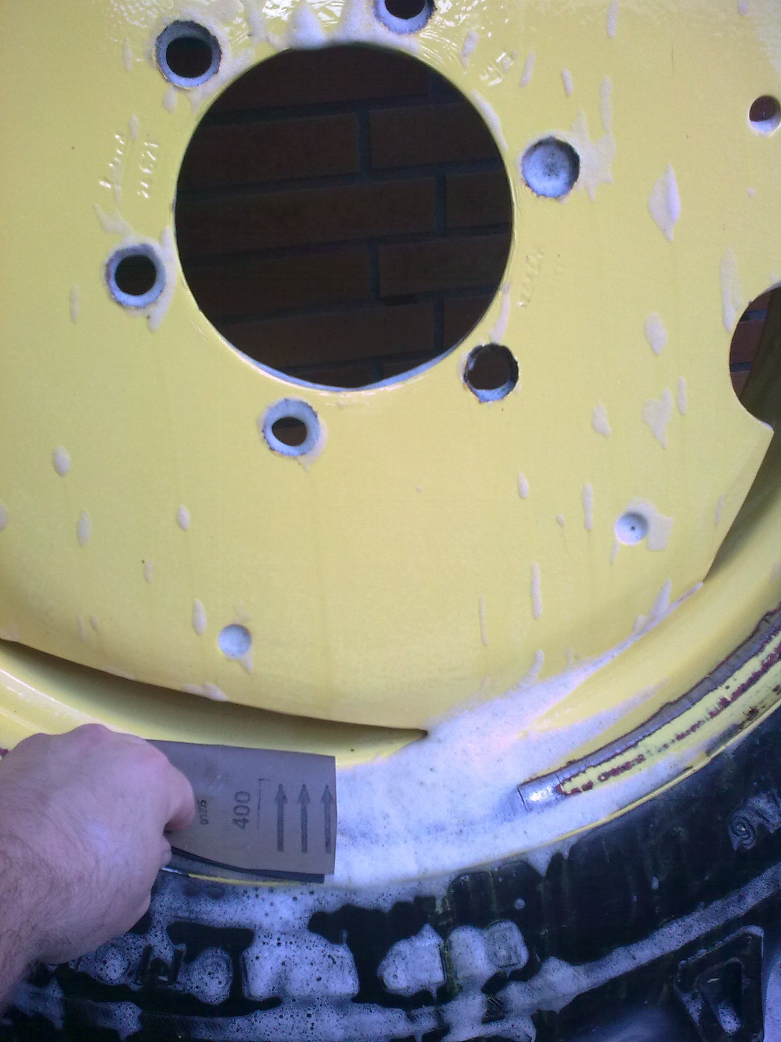 Die Grundierung wird in mehreren Durchgängen auf die defekten Lackstellen gespritzt. Also komplett drumherum. Normalerweise könnte man jetzt 24 Stunden später schon den Decklack auftragen, aber da nach der Trocknung noch Unebenheiten sichtbar wurden entschloss ich mich dazu, nochmal drei Tage zu warten. Die bessere Duchtrocknung der Grundierung ermöglicht jetzt einen letzten Schliff mittels grauem Schleifpad. Dadurch werden die letzten scharfkantigen Ränder nahezu egalisiert. Wichtig beim Arbeiten ist es nun auf fettfreie Hände und sauberes Schleifpad zu achten. Am besten Einweghandschuhe tragen. Weil nach dem Pad kommt kein Silikonentferner mehr zum Einsatz. Ich habe das einmal gemacht und der Silikonentferner hat die ganze Suppe angelöst und ich hatte später Runzeln im Lack.