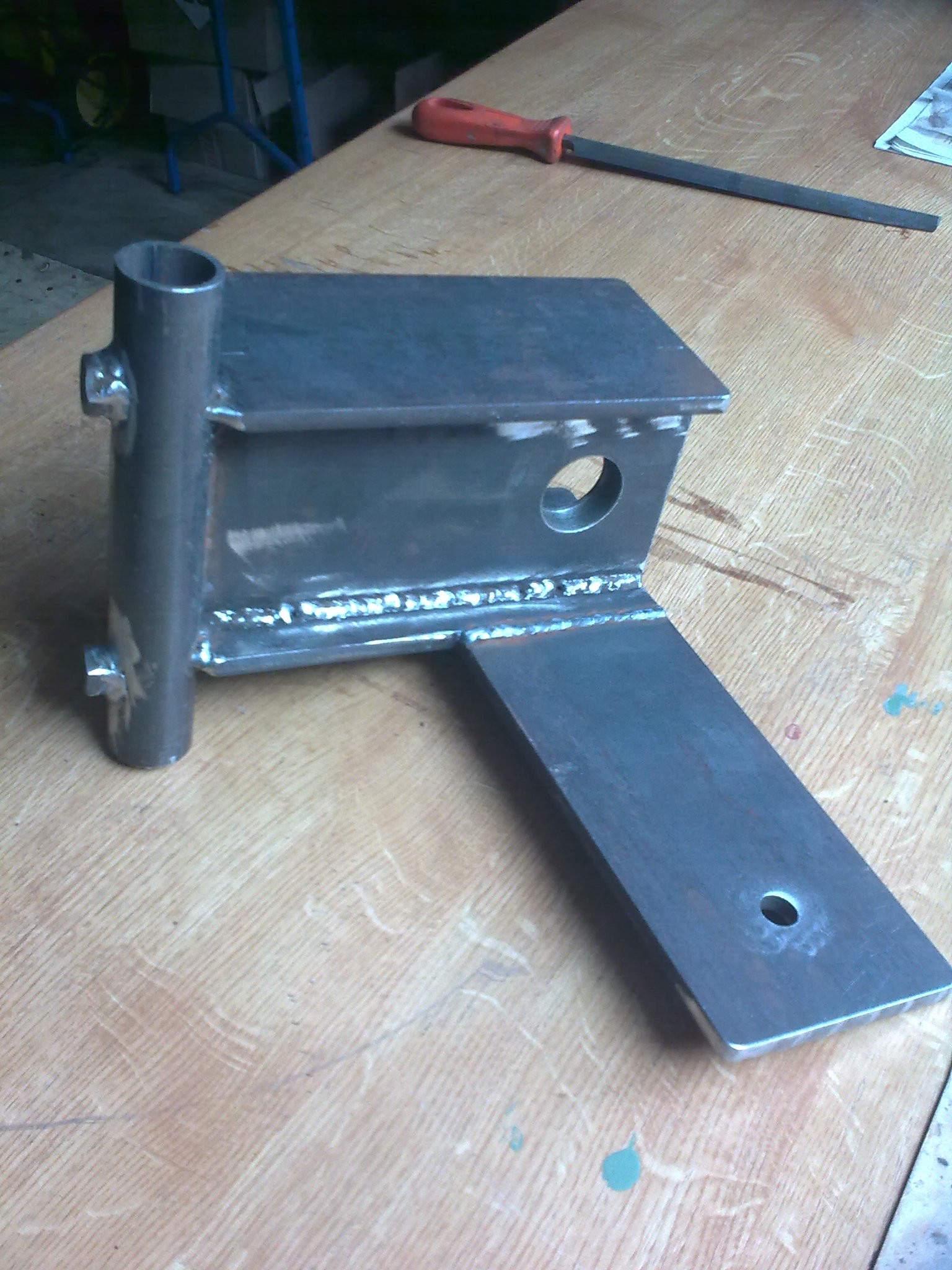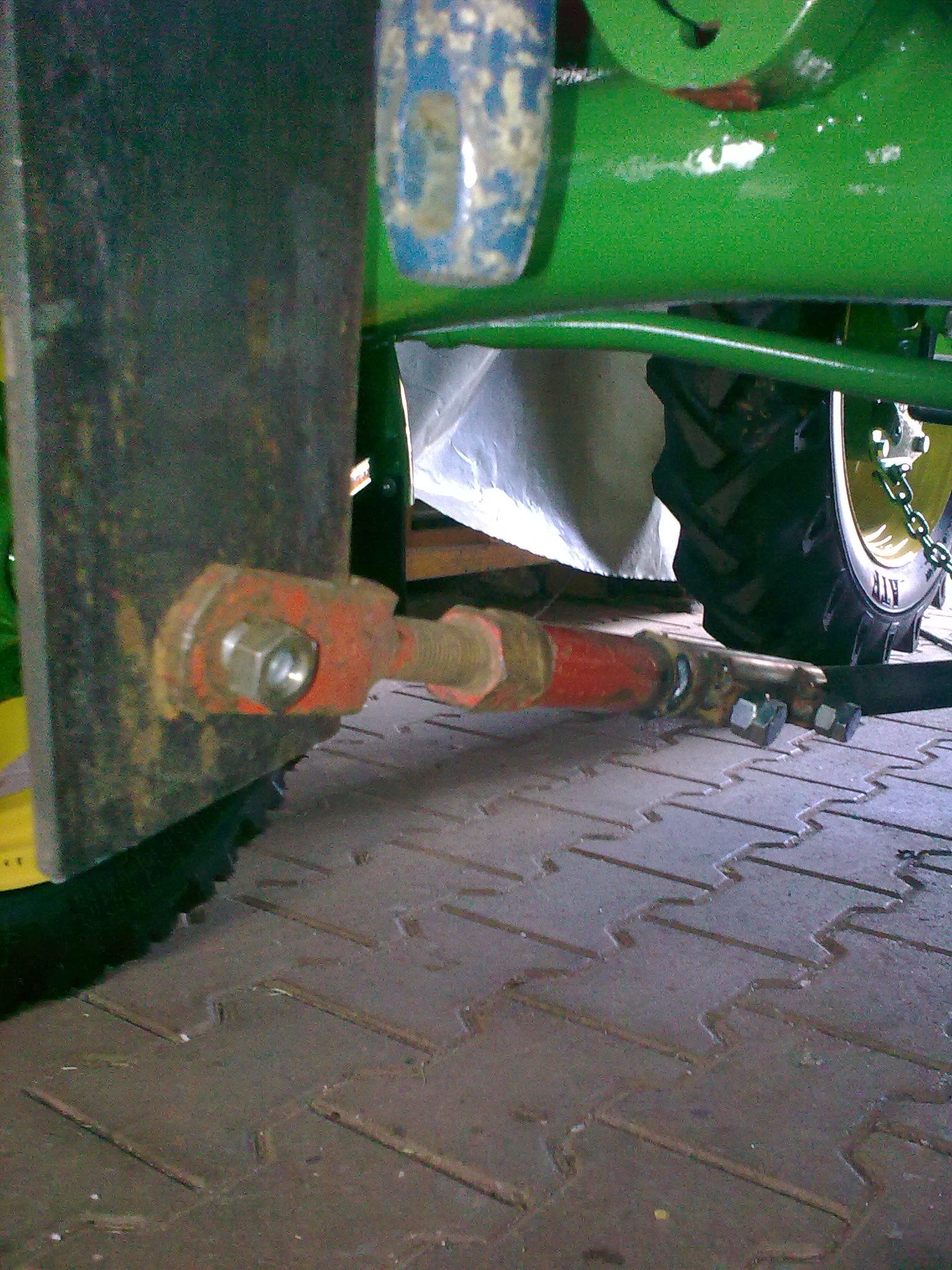 Bevor es soweit war, habe ich die Zugdeichsel nochmal ein wenig seitlich stabilisiert. Dazu habe ich vorne am Teil das an der Anhängekupplung eingehangen wird ein Flachstahl nach unten angeschweißt und mit einer Bohrung versehen. In die Bohrung kommt ein Bolzen der eine Gabel mit Gewinde hält. An der Gabel ist eine Klemmmuffe angeschweißt. Das Ganze ist also wieder in der Länge verstellbar um ungefähr 30 cm. Je nach Schlepper. Dann habe ich mir ein Rohr gebogen, welches in die Klemmmuffe eingeschoben wird. An das Rohr wurde ein Rohr geschweißt, welches Richtung Zugdeichsel des Schleppers verläuft. An der Zugdeichsel habe ich wieder ein Flachstahl angeschweißt mit der Bohrung passend für einen Anhängebolzen. Der Anhängebolzen wurde an eine weitere Klemmschelle geschweißt. Die Klemmschelle wird über das Rohr geschoben, was von vorne unter dem Schlepper her kommt. Nun kann man den Fangkorb oder besser die Zugdeichsel seitlich stabilisieren aber es bleibt in alle Richtungen einstellbar. Wegen dem Anhängebolzen an der Zugdeichsel und der Gabel vorne an der Anhängekupplung ist alles leicht und werkzeuglos demontierbar.