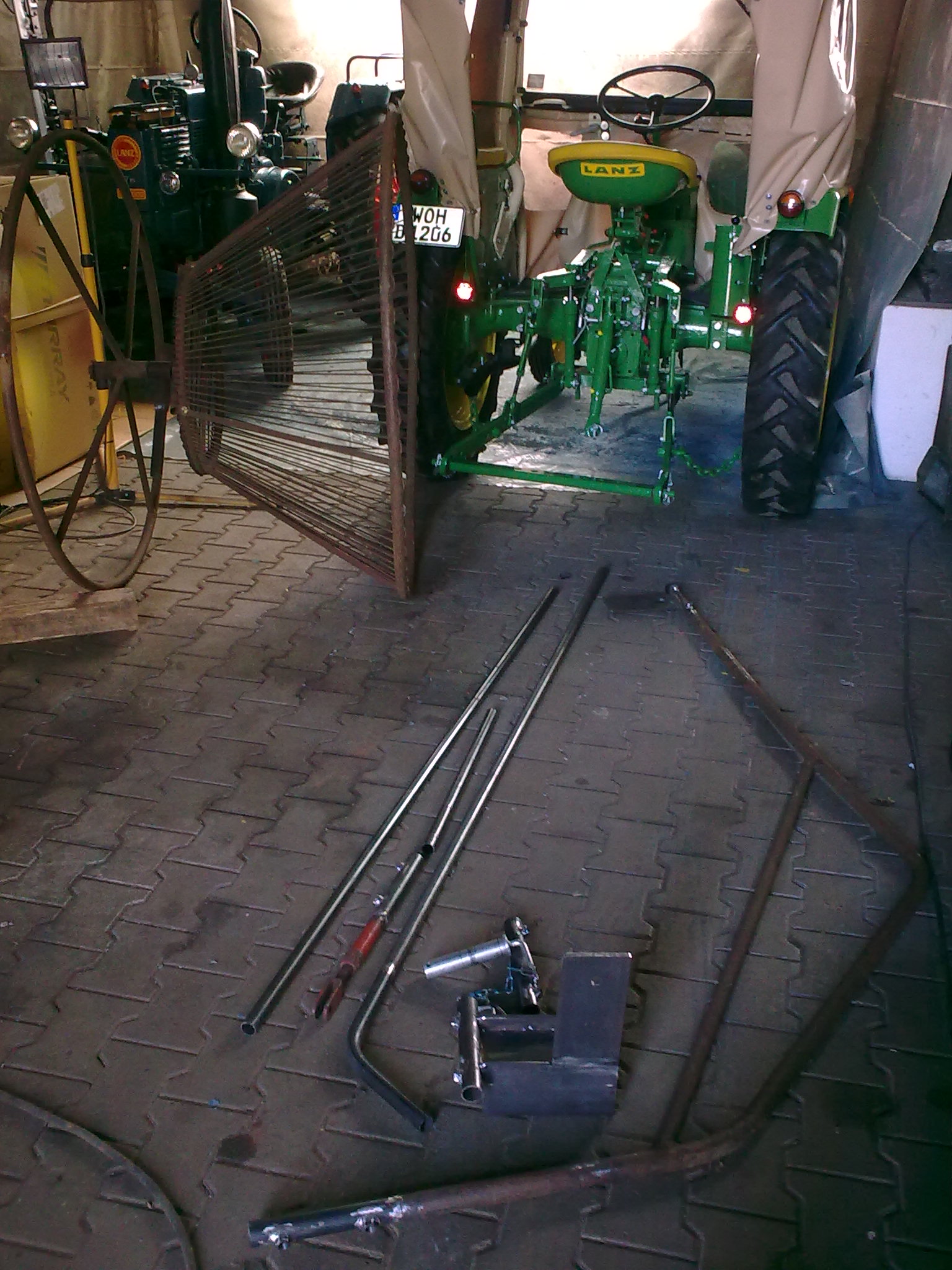 Damit die "Kleine" ein bißchen was zum spielen hat, habe ich über ebay einen John Deere Lanz SR1 Kartoffelroder gekauft. Paßt optisch und vom Namen perfekt zum Schlepper. Dabei war noch ein Grimme Fangkorb für Pferdezug. Gestern und heute habe ich das mal ein wenig für Schlepperzug umgebaut. Bin noch nicht fertig. Die Bilder zeigen den momentanen Zustand. Ziel soll es werden das so zu bauen, dass man den Fangkorb auch wieder für Pferdezug benützen kann und gleichzeitg nicht nur für Zapfwellenschleuderradroder sondern auch für gezogene mit Radantrieb. Wir haben z.B. auch einen gezogenen Schmotzer Roder. Von der Mitte der Ackerschiene bis zum Schleuderrad sind das ungefähr 150 cm. Beim SR1 sind es 51 cm. Das Gestänge des Fangkorb habe ich also in der Länge verstellbar gebaut. Die Roder sollen aber auch an verschiedenen Schleppern angebaut werden können, also habe ich das auch gleich in der Breite verstellbar gebaut. Momentan con 70 cm zwischen Schleppermitte und Fangkorb bis zu 130 cm zwischen Schleppermitte und Fangkorb. Die richtige Schleuderraddrehzahl und der passende Fangkorbabstand muss und kann somit je nach Kartoffelroder und Schlepper eingestellt werden. Ziel muss sein, dass die Kartoffeln beim Auffprall im Korb nicht beschädigt werden. Je nach Bodenbeschaffenheit kann man ebenfalls mit dem Korbabstand variieren. Die Kartoffelreinigung wird sich auf Sandboden anders verhalten wie auf Lehmboden.