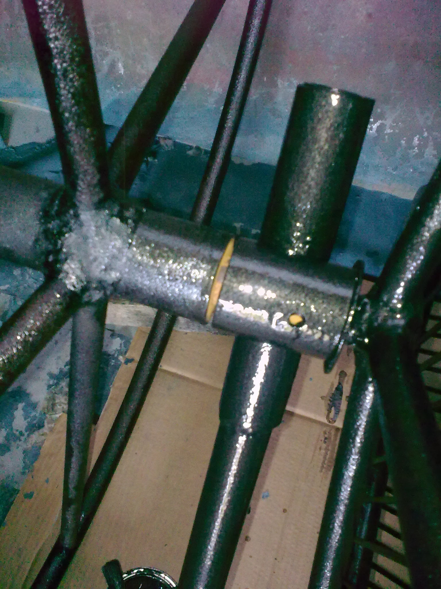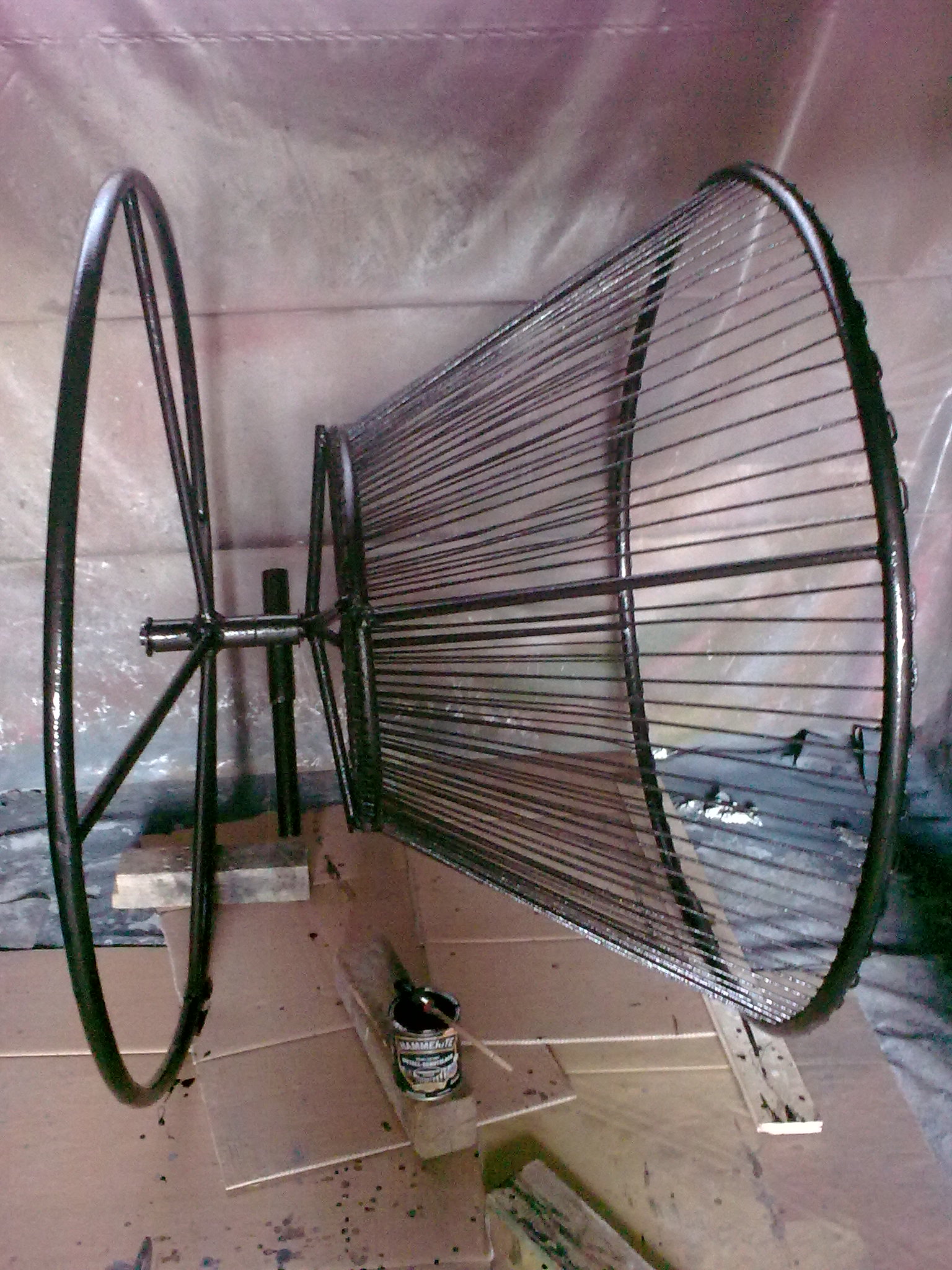Die Datei ist immer noch zu groß. Egal. Wie grundierte Teile aussehen weis man ja auch so. Gestern habe ich den kompletten Korb sowie die Anbauteile lackiert. Ich habe mich für Hammerschlag schwarz entschieden. Black is beautifull! Oder auch Back in Black! 8) Die Begründung warum Hammerschlag schwarz ist einmal die, weil es zu jeder Schlepper und Roder Kombination optisch gut paßt und zum zweiten ist Hammerschlag einfach genial zum nachbessern bei eventuellen Blessuren. Die Rohre habe ich dünn mit Hammerschlag schwarz aus der Spraydose lackiert, damit man die Rohre noch gut ineinanderschieben kann. Das geniale an dieser Farbe von Hammerit ist, dass sie sehr schnell trocknet. Drei Stunden nach dem lackieren konnte ich die Rohre schon in die Hand nehmen und von draußen, wo ich lackiert habe, in die Scheune tragen. Für den Korb und das vordere Zugmaulteil habe ich mir eine Dose 750 ml Hammerschlag schwarz gekauft. Zu meinem Erstaunen ging dabei die ganze Dose fast komplett drauf. Aber es sind auch etliche Meter Streicharbeit gewesen. Erst habe ich die dünnen Stäbe am Korb von innen lackiert, später dann von außen. Dann folgten die anderen Rohre und Teile vom Korb.