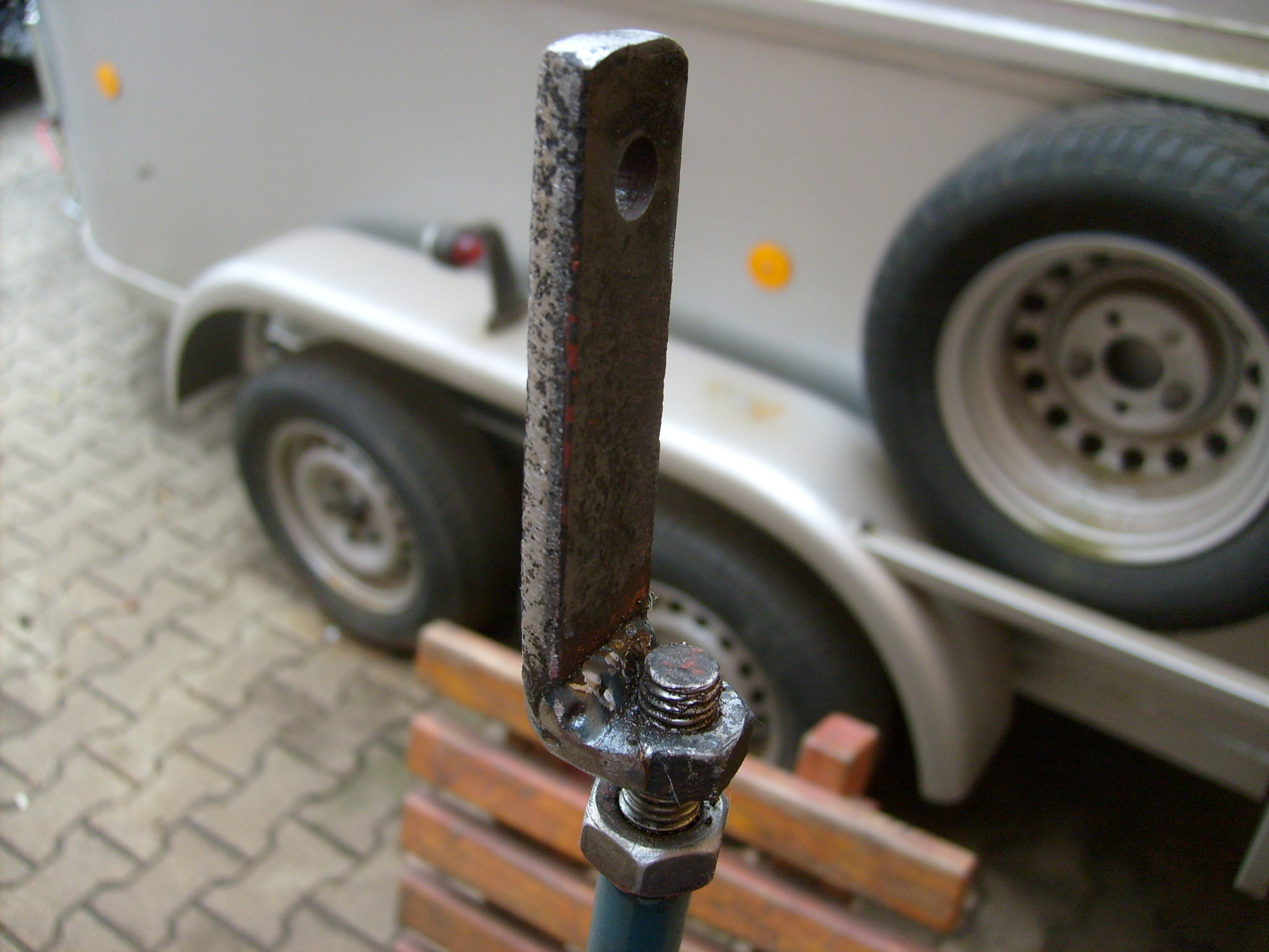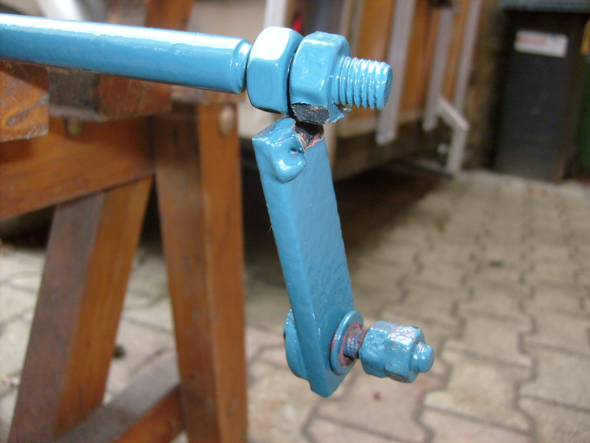 Nach der Montage der Kupplungsstange, die das Kupplungspedal mit dem Ausrückhebel der Kupplung verbindet und dem Versuch die beiden gekonterten Muttern zu lösen, brach die angeschweißte Lasche ab :shock: . War wohl eine echte Verkaufsschweißung. Anpunkten und weg damit. Gut das das nicht bei der ersten Probefahrt auf dem Hof passiert ist. Mein Nachbar hätte sich über den Abdruck der Vorderachsaufnahme in seinem neuen Auto gefreut... :lol: Ab Werk war hier wohl wie auch bei der Serienausführung schon eine Gabel vorgesehen sein. Im Laufe der Zeit wurde das mal geändert. Grund unbekannt. Vielleicht ist da was kaputt gegangen bei der Rolle seitwärts im Wald. Wir haben das jetzt jedenfalls wieder so belassen und repariert.