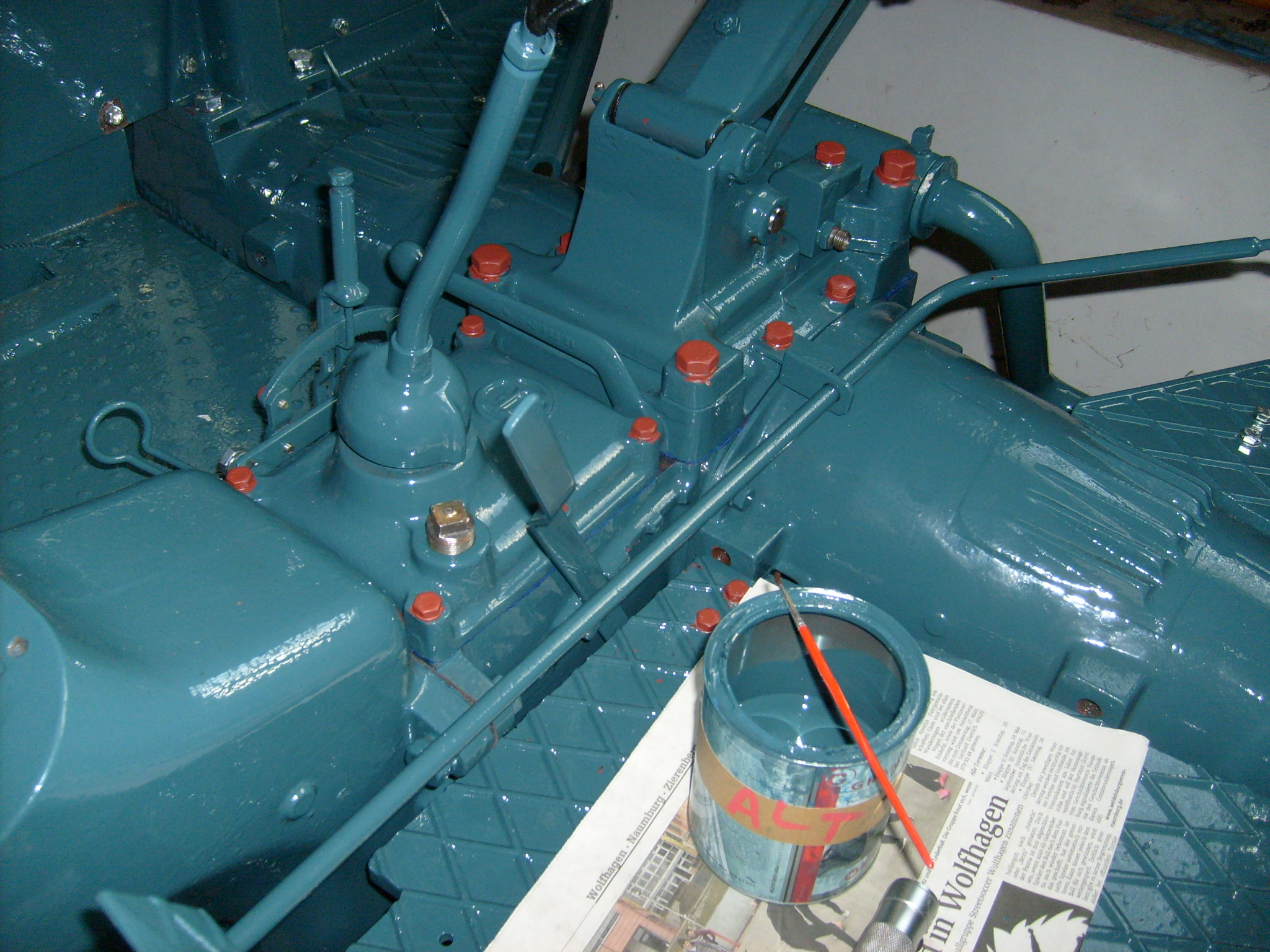 Das grundieren der Schrauben geht am besten, wenn man sich auf eine Schlepperseite stellt und alle Schrauben so anpinselt wie man sie von dieser Standposition aus gut erreichen kann, ohne sich unnötig dabei zu verbiegen. Dann wechselt man die Schlepperseite und pinselt die Flächen der Schraubteile an, die man von der anderen Seite nicht gut erreichen konnte. Dann wechselt man auf die Rückseite des Schleppers und kann von dort jeweils die verbleibenden Flächen pinseln. Beim blau lackieren geht man ebenso vor.