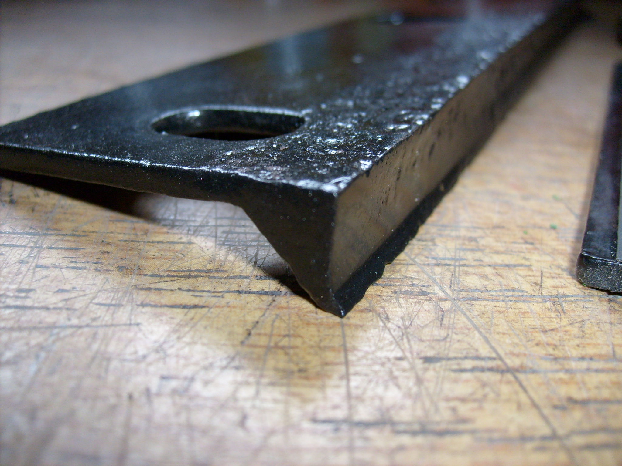 Diese kürzere Messerführung hat auch keine Langlöcher und die dritte kleinere 10mm Bohrung, die für die Aufnahme des innersten Mähfingers dient, liegt näher an den beiden 12 mm Bohrungen. Die kürzere Messerführung wird logisch, wenn man bedenkt, dass das Mittelschnittmähwerk auch mehr Mähfinger hat als das Normalschnittmähwerk. Man kann also die innere Messerführung ohne Abänderung vom Mittelschnittmähwerk für das Normalschnittmähwerk verwenden, aber nicht umgekehrt. Aber das habe ich nur beiläufig festgestellt. Der Grund für den skeptischen Blick in die Ersatzteilliste war folgende Frage:
