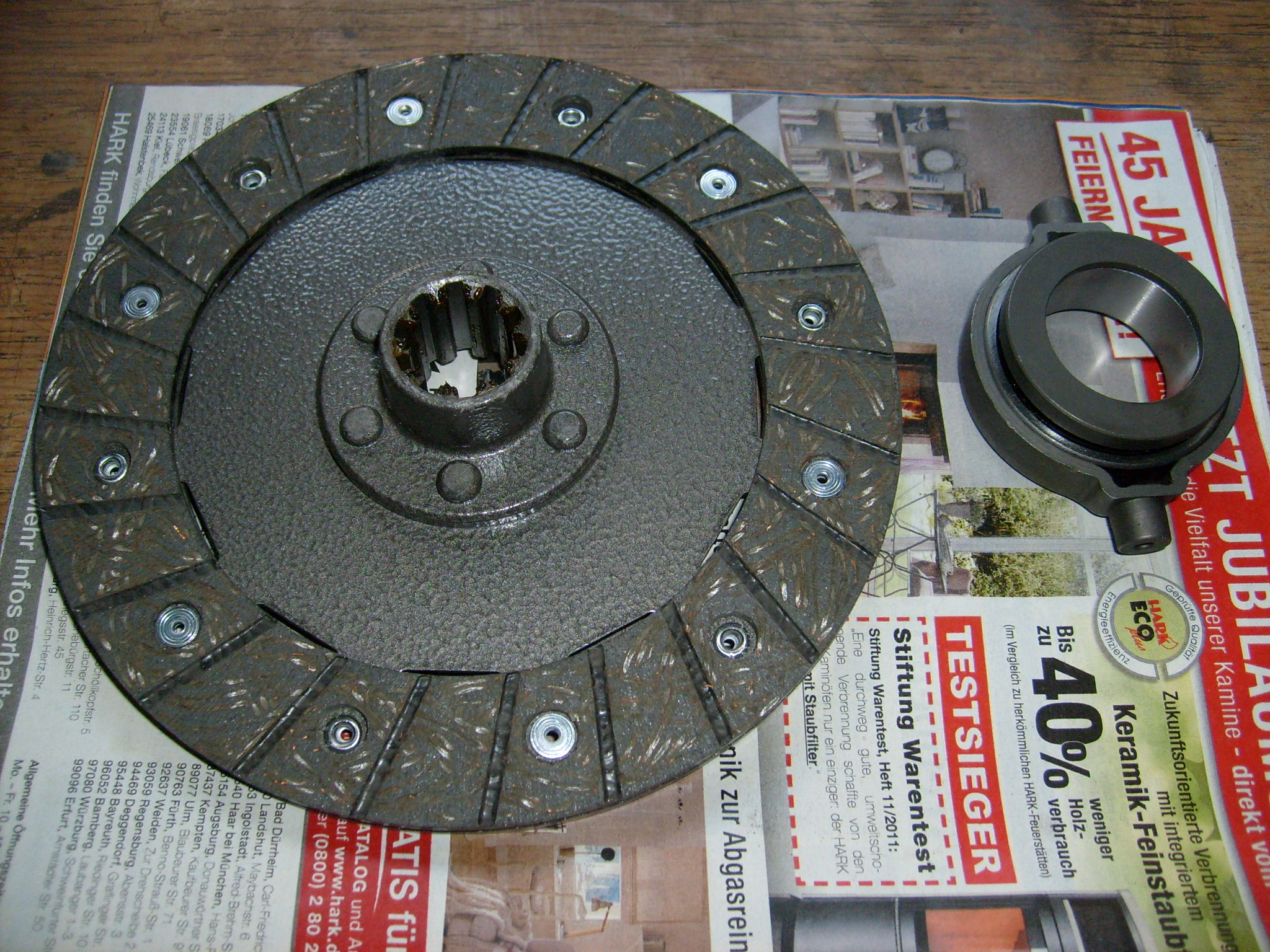 Gestern konnten wir die neu belegte Kupplungsscheibe und das neue Ausrücklager aus Kassel holen. Die Kupplungsscheibe wurde entrostet und neu lackiert. Das Ausrücklager mit dem Graphitring war nicht mehr erhältlich. Aber es gibt als Ersatz eines mit Kugellager, ist ja im Prinzip sogar besser.