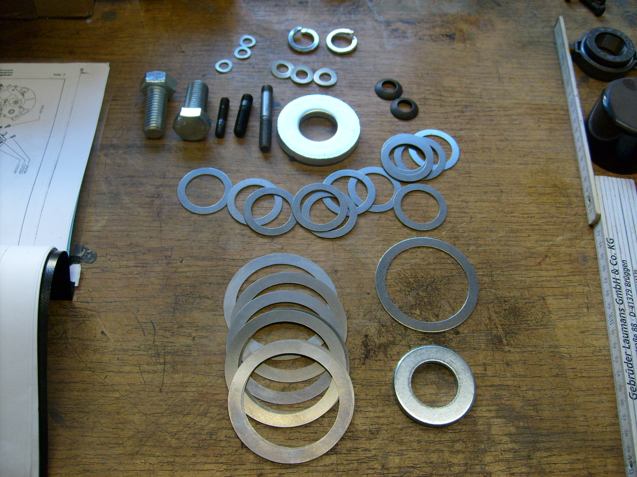 Erstaunlich das die auf dem Bild gezeigten Teile so einfach fehlen können, wenn man einen Schlepper auseinander nimmt. Jede Menge Distanzscheiben, drei Stehbolzen. Die beiden M 18 er Schrauben samt Federringen für die Anhängerkupplung sind auch dabei und wurden bereits montiert. Ebenso die beiden Konusscheiben für das Bremsgestänge.