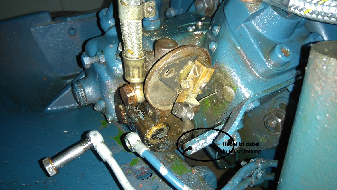 Dabei ist im Prinzip der Hebel am Regler selbst in Ruhestellung und der Hebel an der Ölpume ist auch in Ruhestellung. Der Weg des Hebels an der Ölpumpe bis zum Anschlag ist durch diese Einstellschraube begrenzt. Der Weg ist derzeit ca. 2-3mm.