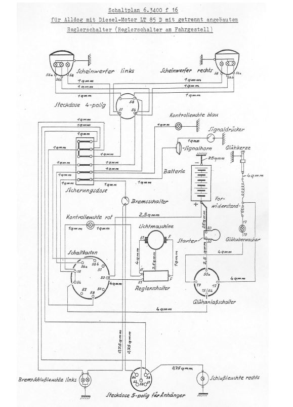 Entsprechend der Motorentwicklung während der Bauzeit des Lanz-Alldog gibt es 3 verschiedene Schaltpläne der elektrischen Anlage.