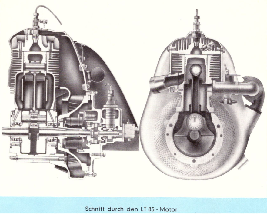 Nachdem ich also weiter zu den Blockhälften recherchiert hatte stieß ich auf ein großes Problem. Selbst in den Kundenmonteuranweisungen von Lanz wird nicht beschrieben wie die Blockhälften zu trennen sind. Es wird nur darauf verwiesen, dass man die kaputte Baugruppe einsenden und einen Ersatz einbauen sollte. In meinem Fall also eine schwierige Situation, aber ich dachte mir was man zusammenkriegt muss auch auseinandergehn, oder? Mit diesem Gedanken im Hinterkopf probierte ich es also nocheinmal mit dem Eigenbauabzieher auf der kurzen Seite der Kurbelwelle und es kam wie es kommen musste. Das schwungmassenseitige Lager ist in einem Sackloch eingelassen. Das heißt es ist in die Blockhälfte gepresst und von der nicht einsehbaren Seite mit einer Platte verschraubt. Durch meinen groben Abziehversuch hat sich diese Platte stark verzogen. Nocheinmal Glück im Unglück den der Gussblock hätte ja auch reißen können. Nach diesem Erlebnis habe ich mich nocheinmal nach dem kleinsten Bisschen an Information umgesehen und tatsächlich. In einem Originalprospekt von Triumph zum LT85 (also dem Vorgänger von meinem Motor) findet sich eine Zeichnung die den Block aufgeschnitten zeigt. Auf dieser kann man erkennen, dass das schwungmassenseitige Lager tatsächlich von einer angeschraubten Platte festgeklemmt wird. Jedoch sieht man auch, dass das Lager auf der Lima Seite (dort wo die Kurbelwelle länger ist) durch nichts erkennbares festgehalten wird. Laut Kundendienstanweisung gab es zwar hier und da kleinere Änderungen am Kurbelgehäuse, jedoch war dies bislang die einzige Information auf die ich bauen konnte. Ich habe meinen Abzieher auf der anderen Seite des Blocks mit M5 Gewindestiften (200mm) befestigt und dieses mal nur mit den kleinen Randmuttern abgezogen um einem weiteren Schaden vorzubeugen und tatsächlich die Skizze aus einem Werbekatalog von 1952 hat nicht enttäuscht. Der Block ließ sich mit mittlerem Kraftaufwand langsam trennen und schließlich lagen zwei einzelne Blockhälften vor mir. Zwar steckt die Kurbelwelle jetzt noch in der anderen Blockhälfte fest doch da wird einem sicherlich auch noch etwas einfallen.
