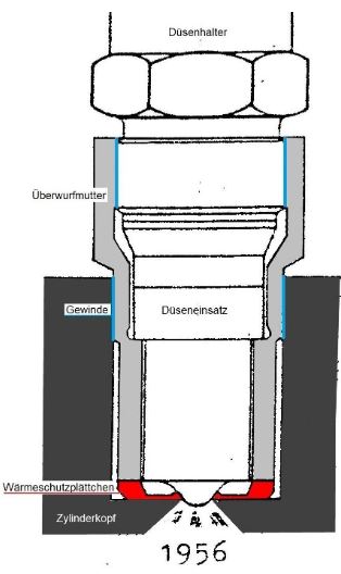 Das Wärmeschutzplättchen kannst Du entsprechend der Zeichnung unten selber herstellen. Dazu brauchst Du eine ca 2mm starke Unterlegscheibe mit passendem Durchmesser und kleiner Bohrung. Die schleifst Du mit der Bohrmaschine schräg so aus, dass die Scheibe die Düsennase wie auf der Zeichnung absolut dicht und fest umschließt, aber die Düsenöffnungen frei lässt. Dann legst Du passende Kupferringe entsprechend der Zeichnung zwischen Scheibe und Düsenmutter. Du wirst geduldig arbeiten müssen, um nach dem Anziehen der Düsenmutter einen einwandfreien Düsensitz mit perfekt abgedichteter Düsennase zu bekommen.