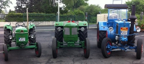 Hier noch mal ein Bild vom letzten Sonntag. Lanz Bulldog D1706 mit Erstbesitzerin, die so manche Anekdote zu erzählen weis. Bei der Rübenernte standen z.B. immer zwei Mann vorne auf der Vorderachse wenn es galt, den beladenen Ackerwagen vom Feld auf den Feldweg zu ziehen. Oder die Geschichte, als der Pendelanlasser defekt war und sie den Nachbar um Hilfe beim Starten bat. Der Nachbar hat nach dem Anlaufen leider vergessen das Anwurfrad loszulassen und landete so etwas unsanft der Länge nach auf dem Boden. Auch gerne genommen: Die auf dem Auspuff vergessene Regenabdeckung in Form einer Blechdose. Sie soll öfters mal durch die Gegend geflogen sein. Einmal geriet ein auf dem Nachbarfeld arbeitender Landwirt in Panik als aus dem Auspuff eine etwa 1 Meter hohe Stichflamme schoss. Er eilte mit einem Eimer Wasser und laut rufend "Der Bulldog brennt!Der Bulldog brennt!" herbei und wollte es oben rein schütten. Mein Oma, die den Bulldog auf Vollgaslaufend verlassen hatte, konnte ihn noch rechtzeitig beruhigen. Das eine Mal, als das Getriebe nicht in Ordnung war konnte sie nur noch rückwärts fahren. Es passierte beim Mähen der Wiese, die ziemlich weit entfernt vom Dorf liegt. Die Hauptstrasse ist sie dann komplett rückwärts gefahren bis zum Dorfrand. Dort war es Ihr zu peinlich rückwärts weiter zu fahren. Sie stellte den Bulldog ab und lief in´s Dorf, um in der ansässigen Werkstatt um Hilfe zu bitten. Noch am selben Tag konnte Sie wieder vorwärts auf den Hof fahren. Der D1706 war übrigens der erste seiner Art im Dorf. Zur Zeit des Kaufs gab es noch einen D9506 Ackerluftbulldog. Als der 17er mit einem LKW geliefert wurde, gab es einen kleinen Menschenauflauf und irgend jemand spottete: "Was ist das denn für ´ne Hungermühle?" Könnte natürlich der Besitzer des D9506 gewesen sein. Meine Oma kann sich daran nicht mehr genau erinnern. Bis 1955 fuhren dann drei "Hungermühlen" im Dorf. Unser 17 er und zwei D2206. Ein D2206 wurde leider verschrottet und der andere verkauft. Von ihm fehlt leider jede Spur. Der 22 er der verschrottet wurde hatte das gleiche Mörtl Mähwerk wie unserer. Irgendwann ging ein Gussteil daran kaputt und meine Oma hat dann das Teil dem Besitzer des D2206 geliehen. Das Teil tauchte aber nie wieder auf. Es wurde vermutlich mit dem Bulldog verschrottet. :kloppe: Mitlerweile, also Jahrzehnte später, konnte ich über Mörtl dieses Teil neu kaufen. Wer hätte das gedacht? Jede Spur fehlt auch vom D9506. Irgendwann kaufte ein Landwirt noch einen D7506 Allzweckbulldog. Doch er hatte ihn an einem steilen Hang umgeworfen und ist gerade noch so mit dem Leben davongekommen. Danach hatte er die Nase voll von Lanz und kaufte einen neuen Hanomag mit etwas kleineren Hinterädern. Kurzum, außer unserem ist kein Lanz mehr im Dorf, der früher auch schon hier gearbeitet hat.