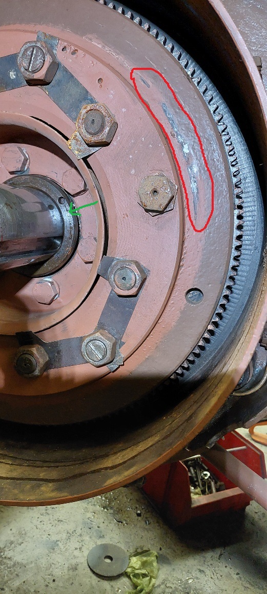 Also es klackert beim Ausrücken der Kupplung, weil der Automat an dem Schwungrad schleift. Siehe rot markiert in den beiden Bildern. Ich denke nicht, dass ich was beim Zusammenbau vergessen habe.