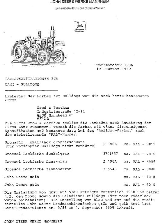 Die Auflistung der blau- Farbtöne im Archiv ist meiner Meinung nach nicht vollständig. Bei mir stehen lebende Beweise. Der D1706 von 1953 war von Haus aus dunkler als das RAL 5009 Azurblau und der andere Bulldog von März 1955 auch. Wobei die Farbtöne von D1706 und dem anderen Bulldog auch wiederum unterschiedlich sind.