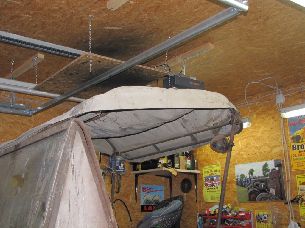 ich habe auf meinem Seitenglühkopf ein Lanz-Verdeck (?), jedenfalls das in der Anlage dargestellte. Dazu habe ich eine Plane ergattert, die zwar etwas geflickt werden mußte, aber genau passt. Was mir allerdings unklar ist: Vorbe wird die um den Rohrträger herumgelegt und der Tunnel dann vernäht, das kann man auch noch gut erkennen. An den Seiten sind die Lederriemen. Aber hinten, wie wird die Plane dort befestigt? Daß dort mal sowas wie Lederriemen o.ä. waren, ist nicht erkennbar. Auf den letzten Treffen, auf denen ich war, war leider kein solches Verdeck zu finden.