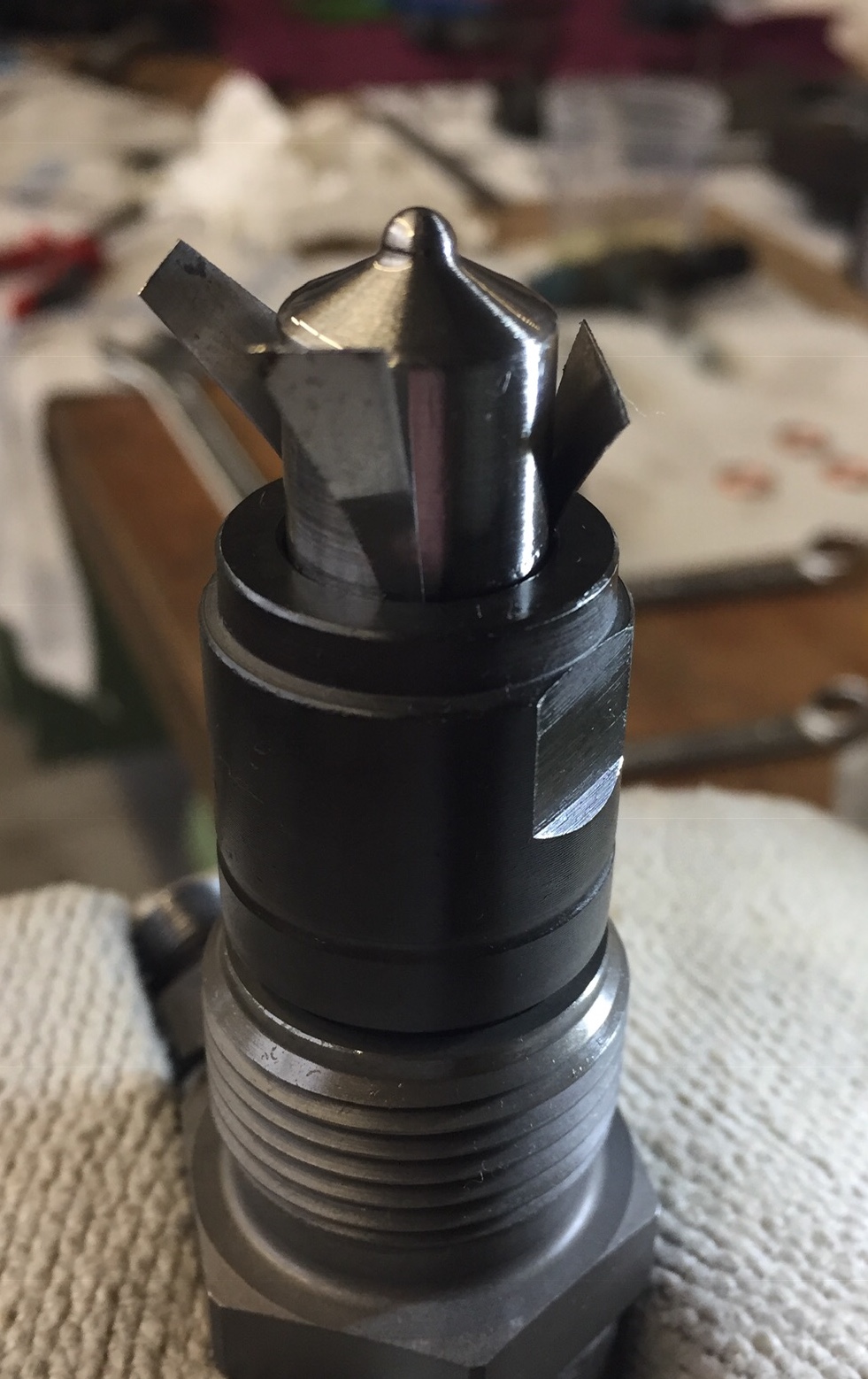 Kleiner Tipp am Rande für jene die selbst ihre Düse überholen möchten: absolute Sauberkeit sollte klar sein, Diesel zum reinigen am besten erstmal durch einen Kaffeefilter schicken. Planflächen sind metallisch dichtend, Kratzer oder Riefen sind tabu, Planflächen können mit hilfe einer Tuschierplatte oder einer dickeren Fensterscheibe und 2000er Nasspapier vorsichtig abgezogen werden. Und das anziehen der Überwurfmutter zum klemmen der Düse mit Gefühl, im besten Fall mit einem Drehmomentschlüssel und einem Maulschlüsselaufsatz. Wichtig ist das Zentrieren der Düse in der Überwurfmutter, in meinem Fall habe ich zurecht geschnittene Blechstreifen (0,2mm) verwendet. Sitz die Düse nicht mittig, oder liegt radial an der Überwurfmutter an, kann es beim warm werden der Düse zu Verspannungen kommen, was die Funktion beeinträchtigen kann.