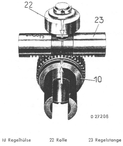 Zahnstange und Reglerhülse haben beide eine Markierung, die fluchten müssen.